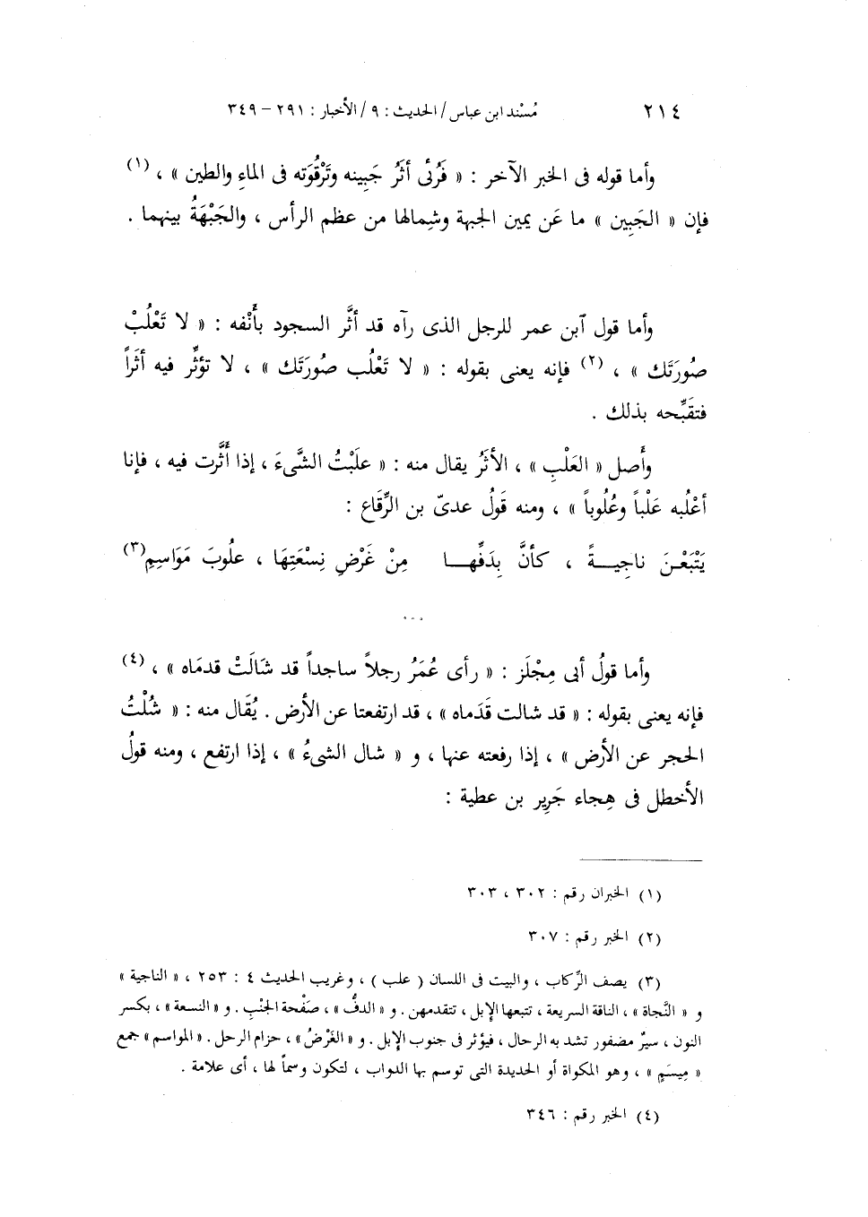 وَأَمَّا قَوْلُهُ فِي الْخَبَرِ الْآخَرِ: فَرُئِيَ أَثَرُ جَبِينِهِ وَتَرْقُوَتِهِ فِي الْمَاءِ وَالطِّينِ " فَإِنَّ الْجَبِينَ مَا عَنْ يَمِينِ الْجَبْهَةِ وَشِمَالِهَا مِنْ عَظْمِ الرَّأْسِ، وَالْجَبْهَةُ بَيْنَهُمَا، وَأَمَّا قَوْلُ ابْنِ عُمَرَ لِلرَّجُلِ الَّذِي رَآهُ قَدْ أَثَّرَ السُّجُودُ بِأَنْفِهِ: لَا تَعْلُبْ صُورَتَكَ، فَإِنَّهُ يَعْنِي بِقَوْلِهِ: لَا تَعْلُبْ صُورَتَكَ: لَا تُؤَثِّرْ فِيهِ أَثَرًا فَتُقَبِّحُهُ بِذَلِكَ، وَأَصْلُ الْعَلْبِ: الْأَثَرُ، يُقَالُ مِنْهُ: عَلَبْتُ الشَّيْءَ إِذَا أَثَّرْتُ فِيهِ، فَأَنَا أَعْلُبُهُ عَلْبًا وَعُلُوبًا، وَمِنْهُ قَوْلُ عَدِيِّ بْنِ الرِّقَاعِ: