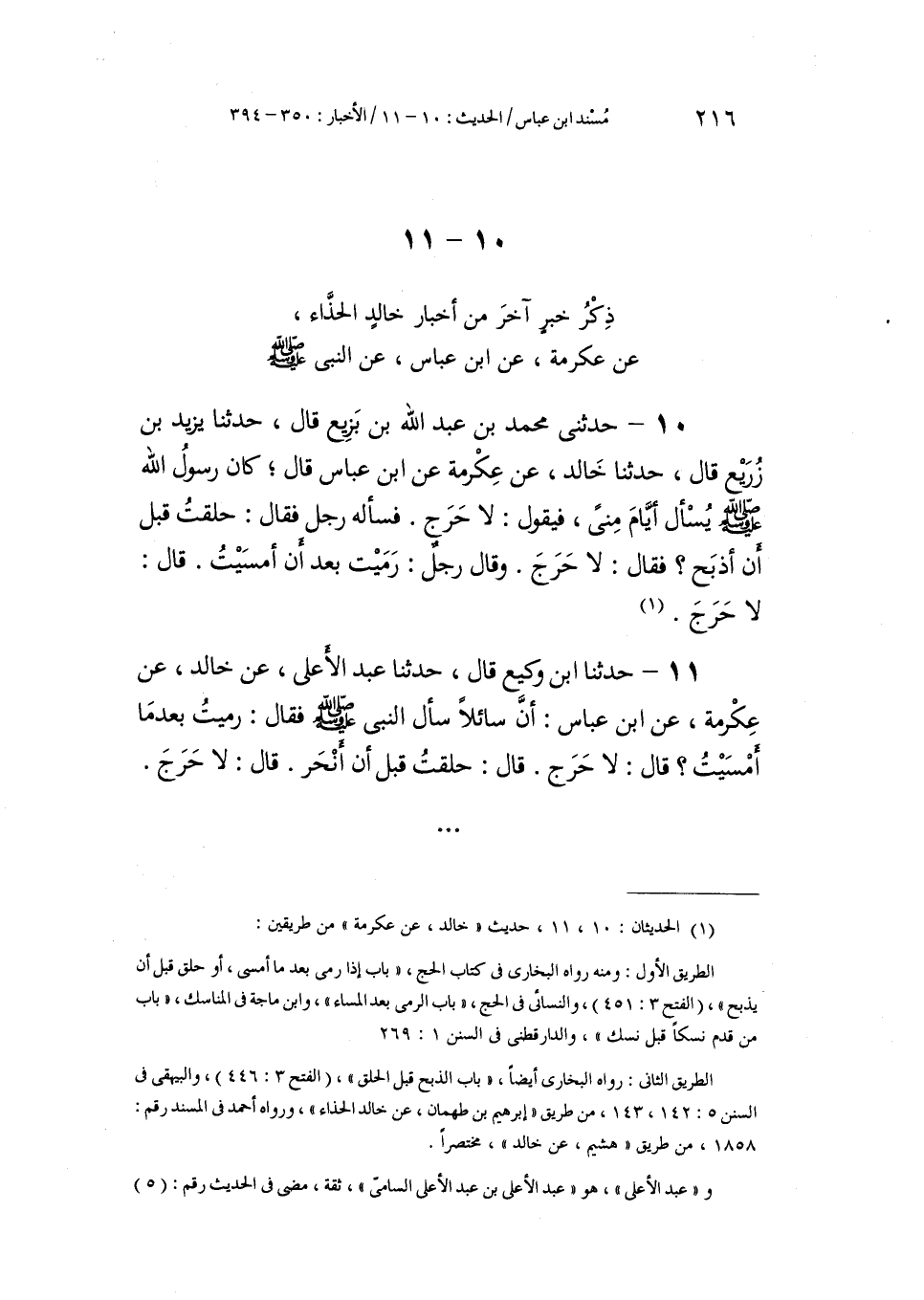 حَدَّثَنَا ابْنُ وَكِيعٍ، قَالَ: حَدَّثَنَا عَبْدُ الْأَعْلَى، عَنْ خَالِدٍ، عَنْ عِكْرِمَةَ، عَنِ ابْنِ عَبَّاسٍ أَنَّ سَائِلًا سَأَلَ النَّبِيَّ صَلَّى اللهُ عَلَيْهِ وَسَلَّمَ فَقَالَ: §رَمَيْتُ بَعْدَ مَا أَمْسَيْتُ؟ قَالَ: «لَا حَرَجَ» ، قَالَ: حَلَقْتُ قَبْلَ أَنْ أَنْحَرَ قَالَ: «لَا حَرَجَ» -[217]- الْقَوْلُ فِي عِلَلِ هَذَا الْخَبَرِ: وَهَذَا خَبَرٌ عِنْدَنَا صَحِيحٌ سَنَدُهُ، لَا عِلَّةَ فِيهِ تُوَهِّنُهُ، وَلَا سَبَبَ يُضَعِّفُهُ، وَقَدْ يَجِبُ أَنْ يَكُونَ عَلَى مَذْهَبِ الْآخَرِينَ سَقِيمًا غَيْرَ صَحِيحٍ لِعِلَلٍ: إِحْدَاهَا: أَنَّهُ خَبَرٌ قَدْ حَدَّثَ بِهِ عَنْ عِكْرِمَةَ أَيُّوبُ السَّخْتِيَانِيُّ فَأَرْسَلَهُ عَنْهُ، وَلَمْ يَجْعَلْ بَيْنَهُ وَبَيْنَ النَّبِيِّ صَلَّى اللهُ عَلَيْهِ وَسَلَّمَ أَحَدًا، وَإِنْ كَانَ بَعْضُ رُوَاتِهِ قَدْ وَصَلَهُ عَنْهُ، وَالثَّانِيَةُ: أَنَّهُ خَبَرٌ قَدْ حَدَّثَ بِهِ عَنْ خَالِدٍ الْحَذَّاءِ غَيْرُ مَنْ ذَكَرْتُ، فَأَرْسَلَهُ عَنْهُ عَنْ عِكْرِمَةَ، وَلَمْ يَجْعَلْ بَيْنَ عِكْرِمَةَ وَبَيْنَ النَّبِيِّ صَلَّى اللهُ عَلَيْهِ وَسَلَّمَ ابْنَ عَبَّاسٍ، وَالثَّالِثَةُ: أَنَّهُ مِنْ نَقْلِ عِكْرِمَةَ، وَفِي نَقْلِهِ عِنْدَهُمْ نَظَرٌ؛ لِأَسْبَابٍ قَدْ بَيَّنَّاهَا قَبْلُ، وَالرَّابِعَةُ: أَنَّهُ مِنْ رِوَايَةِ خَالِدٍ عَنْ عِكْرِمَةَ، وَفِي رِوَايَةِ خَالِدٍ عِنْدَهُمْ مَا قَدْ تَقَدَّمَ بَيَانُهُ قَبْلُ