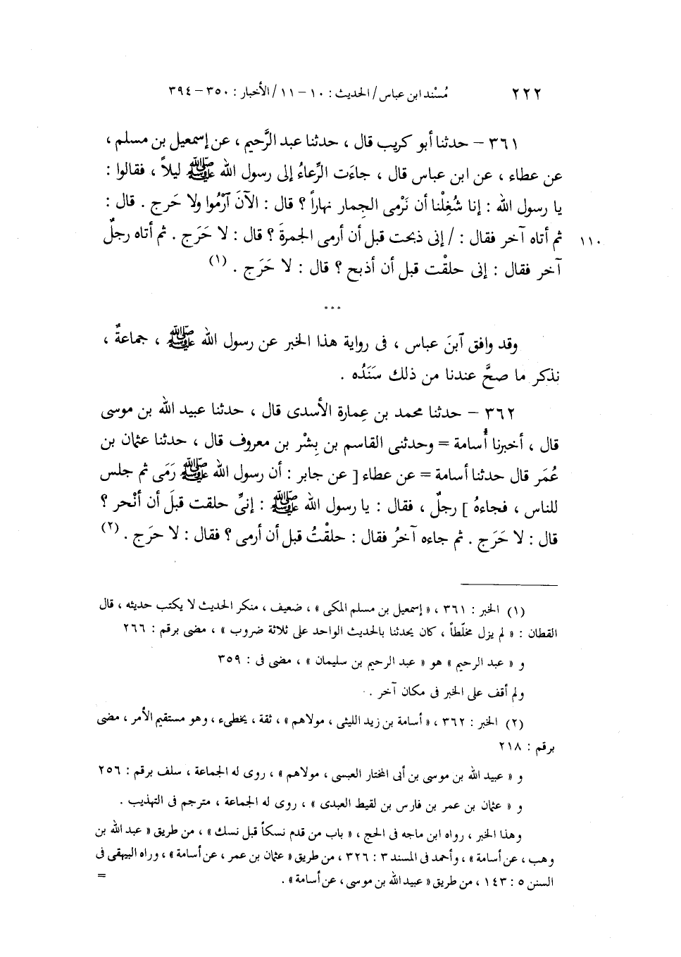362 - حَدَّثَنَا مُحَمَّدُ بْنُ عُمَارَةَ الْأَسَدِيُّ، قَالَ: حَدَّثَنَا عُبَيْدُ اللَّهِ بْنُ مُوسَى، قَالَ: أَخْبَرَنَا أُسَامَةُ، وَحَدَّثَنِي الْقَاسِمُ بْنُ بِشْرِ بْنِ مَعْرُوفٍ، قَالَ: حَدَّثَنَا عُثْمَانُ بْنُ عُمَرَ، قَالَ: حَدَّثَنَا أُسَامَةُ، عَنْ عَطَاءٍ، عَنْ جَابِرٍ أَنَّ رَسُولَ اللَّهِ صَلَّى اللهُ عَلَيْهِ وَسَلَّمَ §رَمَى ثُمَّ جَلَسَ لِلنَّاسِ، فَجَاءَهُ رَجُلٌ، فَقَالَ: يَا رَسُولَ اللَّهِ _ صَلَّى اللهُ عَلَيْهِ وَسَلَّمَ _ إِنِّي حَلَقْتُ قَبْلَ أَنْ أَنْحَرَ؟ قَالَ: «لَا حَرَجَ» ، ثُمَّ جَاءَهُ آخَرُ، فَقَالَ: حَلَقْتُ قَبْلَ أَنْ أَرْمِيَ؟ فَقَالَ: «لَا حَرَجَ»