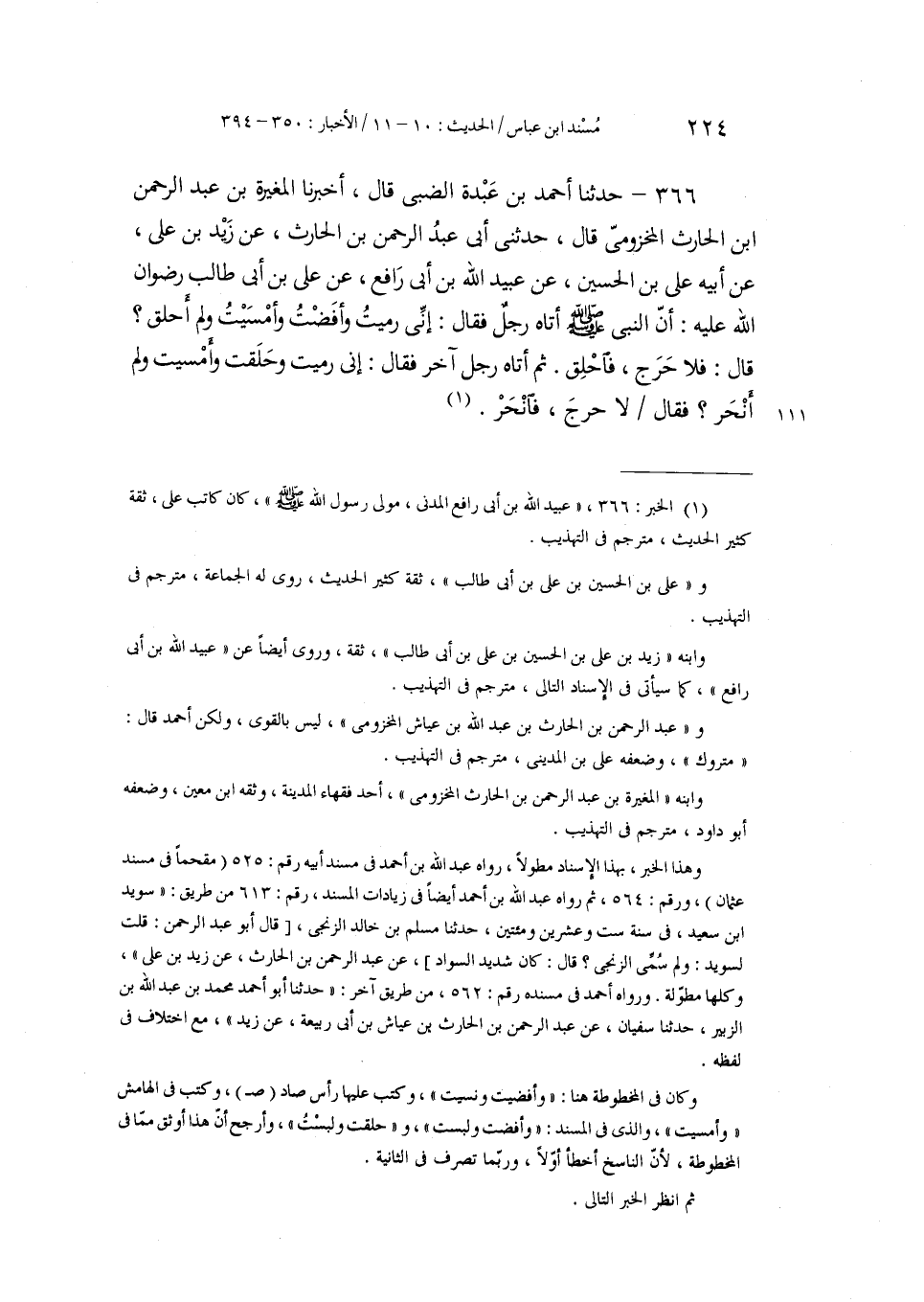 366 - حَدَّثَنَا أَحْمَدُ بْنُ عَبْدَةَ الضَّبِّيُّ، قَالَ: أَخْبَرَنَا الْمُغِيرَةُ بْنُ عَبْدِ الرَّحْمَنِ بْنِ الْحَارِثِ الْمَخْزُومِيُّ، قَالَ: حَدَّثَنِي أَبِي عَبْدُ الرَّحْمَنِ بْنُ الْحَارِثِ، عَنْ زَيْدِ بْنِ عَلِيٍّ، عَنْ أَبِيهِ عَلِيِّ بْنِ الْحُسَيْنِ، عَنْ عُبَيْدِ اللَّهِ بْنِ أَبِي رَافِعٍ، عَنْ عَلِيِّ بْنِ أَبِي طَالِبٍ رِضْوَانُ اللَّهِ عَلَيْهِ أَنَّ النَّبِيَّ صَلَّى اللهُ عَلَيْهِ وَسَلَّمَ أَتَاهُ رَجُلٌ فَقَالَ: إِنِّي §رَمَيْتُ وَأَفَضْتُ وَأَمْسَيْتُ وَلَمْ أَحْلِقْ؟ قَالَ: «فَلَا حَرَجَ، فَاحْلِقْ» ثُمَّ أَتَاهُ رَجُلٌ آخَرُ، فَقَالَ: إِنِّي رَمَيْتُ وَحَلَقْتُ وَأَمْسَيْتُ وَلَمْ أَنْحَرْ؟ فَقَالَ: «لَا حَرَجَ، فَانْحَرْ»