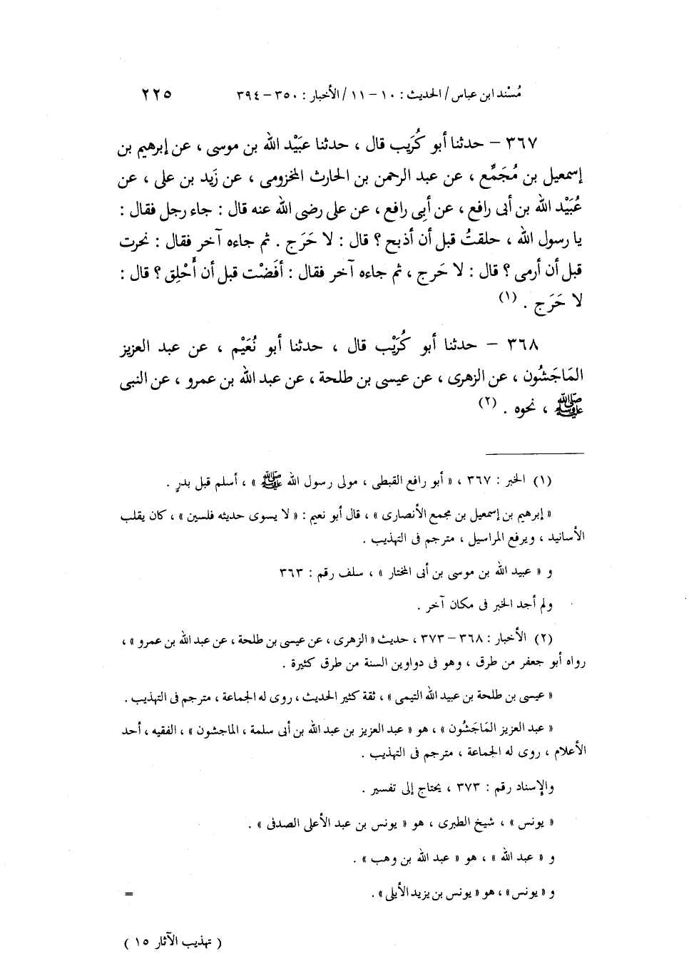 368 - حَدَّثَنَا أَبُو كُرَيْبٍ، قَالَ: حَدَّثَنَا أَبُو نُعَيْمٍ، عَنْ عَبْدِ الْعَزِيزِ الْمَاجِشُونِ، عَنِ الزُّهْرِيِّ، عَنْ عِيسَى بْنِ طَلْحَةَ، عَنْ عَبْدِ اللَّهِ بْنِ عَمْرٍو، عَنِ النَّبِيِّ صَلَّى اللهُ عَلَيْهِ وَسَلَّمَ نَحْوَهُ