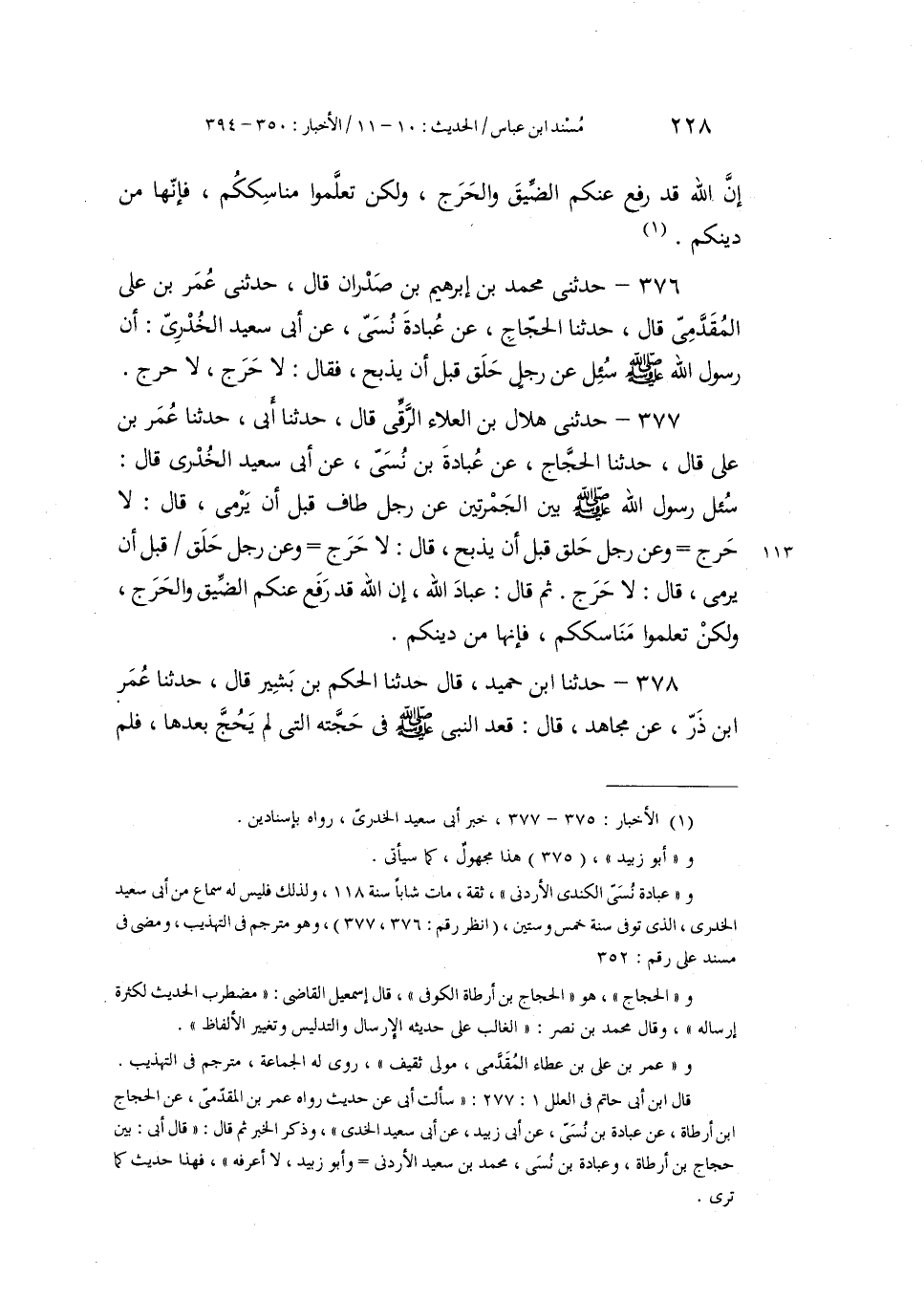 377 - حَدَّثَنِي هِلَالُ بْنُ الْعَلَاءِ الرَّقِّيُّ، قَالَ: حَدَّثَنَا أَبِي، حَدَّثَنَا عُمَرُ بْنُ عَلِيٍّ، قَالَ: حَدَّثَنَا الْحَجَّاجُ، عَنْ عُبَادَةَ بْنِ نُسَيٍّ، عَنْ أَبِي سَعِيدٍ الْخُدْرِيِّ، قَالَ: سُئِلَ رَسُولُ اللَّهِ صَلَّى اللهُ عَلَيْهِ وَسَلَّمَ بَيْنَ الْجَمْرَتَيْنِ عَنْ رَجُلٍ §طَافَ قَبْلَ أَنْ يَرْمِيَ، قَالَ: «لَا حَرَجَ» وَعَنْ رَجُلٍ حَلَقَ قَبْلَ أَنْ يَذْبَحَ، قَالَ: «لَا حَرَجَ» ، وَعَنْ رَجُلٍ حَلَقَ قَبْلَ أَنْ يَرْمِيَ، قَالَ: «لَا حَرَجَ» ، ثُمَّ قَالَ: «عِبَادَ اللَّهِ، إِنَّ اللَّهَ قَدْ رَفَعَ عَنْكُمُ الضِّيقَ وَالْحَرَجَ، وَلَكِنْ تَعَلَّمُوا مَنَاسِكَكُمْ، فَإِنَّهَا مِنْ دِينِكُمْ»