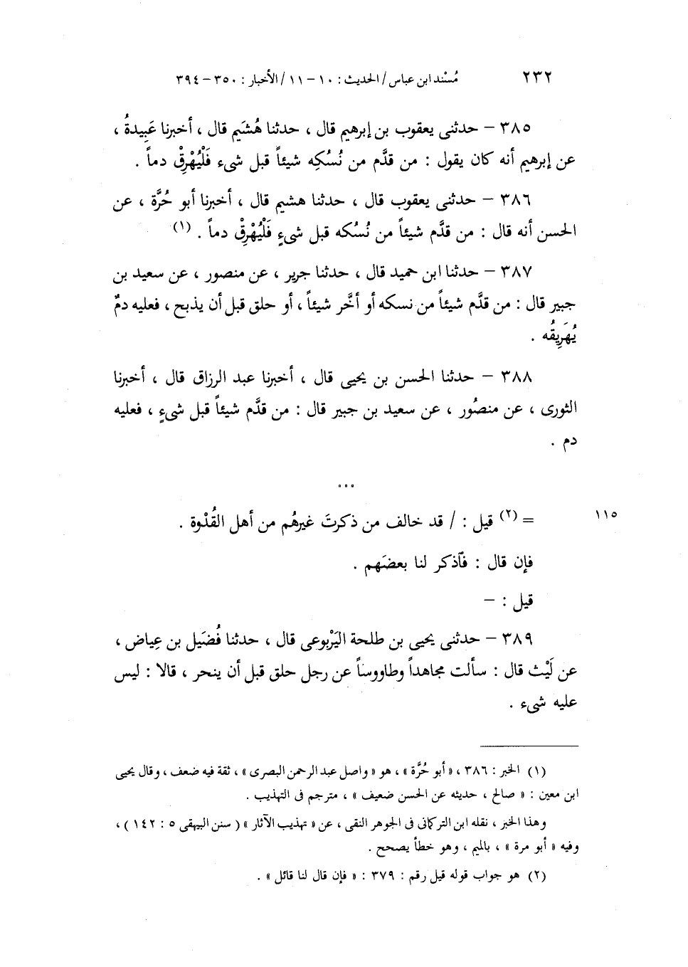 387 - حَدَّثَنَا ابْنُ حُمَيْدٍ، قَالَ: حَدَّثَنَا جَرِيرٌ، عَنْ مَنْصُورٍ، عَنْ سَعِيدِ بْنِ جُبَيْرٍ، قَالَ: «§مَنْ قَدَّمَ شَيْئًا مِنْ نُسُكِهِ أَوْ أَخَّرَ شَيْئًا، أَوْ حَلَقَ قَبْلَ أَنْ يَذْبَحَ، فَعَلَيْهِ دَمٌ يُهْرِيقُهُ»