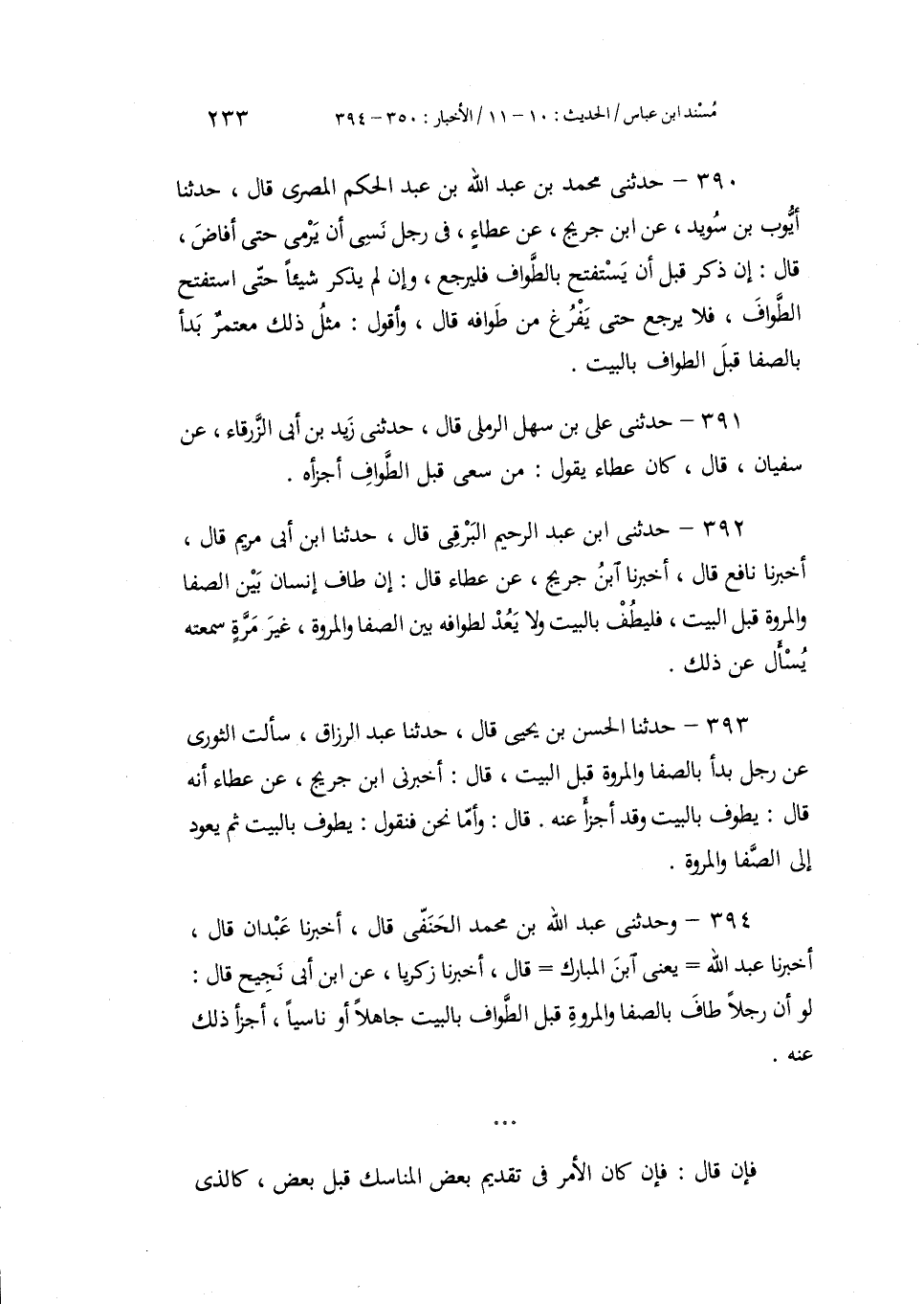 393 - حَدَّثَنَا الْحَسَنُ بْنُ يَحْيَى، قَالَ: حَدَّثَنَا عَبْدُ الرَّزَّاقِ، سَأَلْتُ الثَّوْرِيَّ عَنْ رَجُلٍ، بَدَأَ بِالصَّفَا، وَالْمَرْوَةِ قَبْلَ الْبَيْتِ، قَالَ: أَخْبَرَنِي ابْنُ جُرَيْجٍ، عَنْ عَطَاءٍ أَنَّهُ قَالَ: «§يَطُوفُ بِالْبَيْتِ وَقَدْ أَجْزَأَ عَنْهُ» ، قَالَ: وَأَمَّا نَحْنُ، فَنَقُولُ: يَطُوفُ بِالْبَيْتِ ثُمَّ يَعُودُ إِلَى الصَّفَا، وَالْمَرْوَةِ
