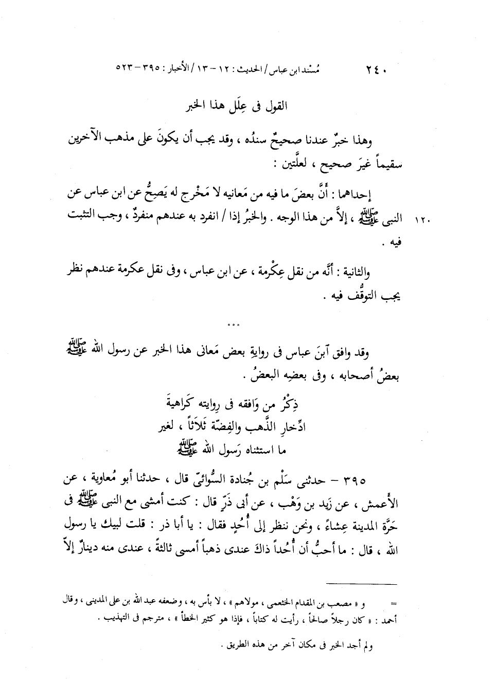 395 - حَدَّثَنِي سَلْمُ بْنُ جُنَادَةَ السُّوَائِيُّ، قَالَ: حَدَّثَنَا أَبُو مُعَاوِيَةَ، عَنِ الْأَعْمَشِ، عَنْ زَيْدِ بْنِ وَهْبٍ، عَنْ أَبِي ذَرٍّ، قَالَ: كُنْتُ أَمْشِي مَعَ النَّبِيِّ صَلَّى اللهُ عَلَيْهِ وَسَلَّمَ فِي حَرَّةِ الْمَدِينَةِ عِشَاءً، وَنَحْنُ نَنْظُرُ إِلَى أُحُدٍ، فَقَالَ: «يَا أَبَا ذَرٍّ» ، قُلْتُ: لَبَّيْكَ يَا رَسُولَ اللَّهِ، قَالَ: «§مَا أُحِبُّ أَنَّ أُحُدًا ذَاكَ عِنْدِي ذَهَبًا أُمْسِي ثَالِثَةً، عِنْدِي مِنْهُ دِينَارٌ إِلَّا -[241]- دِينَارًا أَرْصُدُهُ لِدَيْنٍ، إِلَّا أَنْ أَقُولَ بِهِ فِي عَبَّادِ اللَّهِ هَكَذَا وَهَكَذَا عَنْ يَمِينِهِ، وَعَنْ شِمَالِهِ وَمِنْ قُدَّامِهِ» ، قَالَ: ثُمَّ مَشَى، فَقَالَ: «يَا أَبَا ذَرٍّ» ، قُلْتُ: لَبَّيْكَ يَا رَسُولَ اللَّهِ، قَالَ: «إِنَّ الْأَكْثَرِينَ هُمُ الْأَقَلُّونَ يَوْمَ الْقِيَامَةِ، إِلَّا مَنْ قَالَ بِالْمَالِ هَكَذَا وَهَكَذَا عَنْ يَمِينِهِ، وَعَنْ شِمَالِهِ، وَمِنْ قُدَّامِهِ»