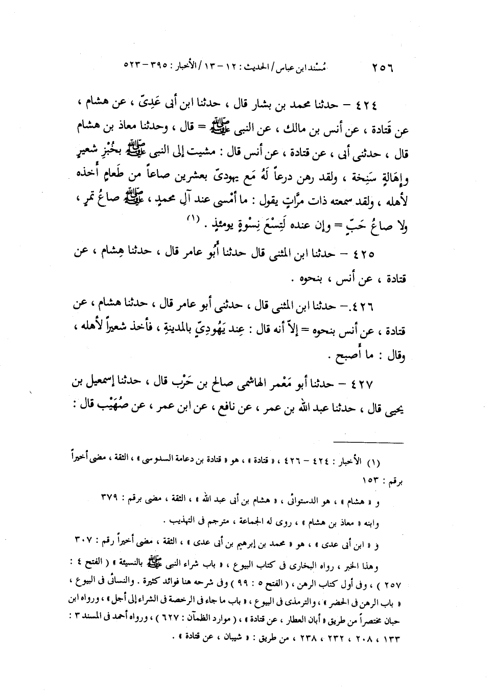 426 - حَدَّثَنَا ابْنُ الْمُثَنَّى، قَالَ: حَدَّثَنِي أَبُو عَامِرٍ، قَالَ: حَدَّثَنَا هِشَامٌ، عَنْ قَتَادَةَ، عَنْ أَنَسٍ، بِنَحْوِهِ، إِلَّا أَنَّهُ قَالَ: عِنْدَ يَهُودِيٍّ بِالْمَدِينَةِ، فَأَخَذَ شَعِيرًا لِأَهْلِهِ، وَقَالَ: مَا أَصْبَحَ