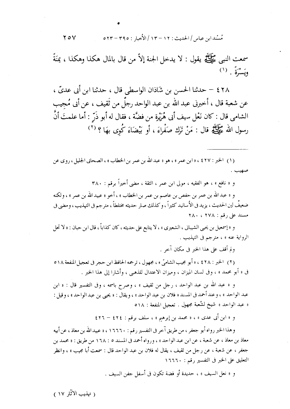 428 - حَدَّثَنَا الْحَسَنُ بْنُ شَاذَانَ الْوَاسِطِيُّ، قَالَ: حَدَّثَنَا ابْنُ أَبِي عَدِيٍّ، عَنْ شُعْبَةَ، قَالَ: أَخْبَرَنِي عَبْدُ اللَّهِ بْنُ عَبْدِ الْوَاحِدِ، رَجُلٌ مِنْ ثَقِيفٍ، عَنْ أَبِي مُجِيبٍ الشَّامِيِّ، قَالَ: كَانَ نَعْلُ سَيْفِ أَبِي هُرَيْرَةَ مِنْ فِضَّةٍ، فَقَالَ لَهُ أَبُو ذَرٍّ: أَمَا عَلِمْتَ أَنَّ رَسُولَ اللَّهِ صَلَّى اللهُ عَلَيْهِ وَسَلَّمَ قَالَ: «§مَنْ تَرَكَ صَفْرَاءَ، أَوْ بَيْضَاءَ كُوِيَ بِهَا»