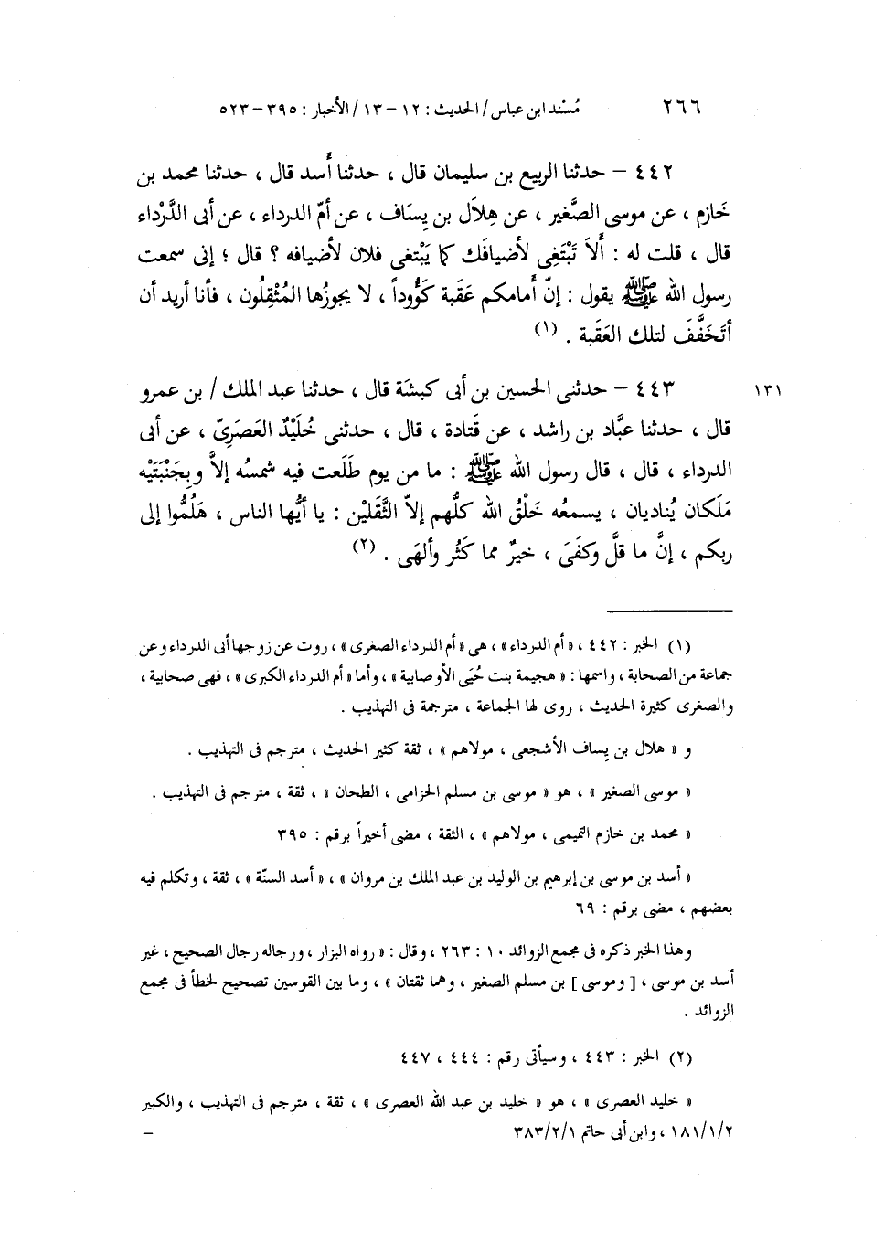 442 - حَدَّثَنَا الرَّبِيعُ بْنُ سُلَيْمَانَ، قَالَ: حَدَّثَنَا أَسَدٌ، قَالَ: حَدَّثَنَا مُحَمَّدُ بْنُ خَازِمٍ، عَنْ مُوسَى الصَّغِيرِ، عَنْ هِلَالِ بْنِ يَسَافٍ، عَنْ أُمِّ الدَّرْدَاءِ، عَنْ أَبِي الدَّرْدَاءِ، قَالَ: قُلْتُ لَهُ: أَلَا تَبْتَغِي لِأَضْيَافِكَ كَمَا يَبْتَغِي فُلَانٌ لِأَضْيَافِهِ؟ قَالَ: إِنِّي سَمِعْتُ رَسُولَ اللَّهِ صَلَّى اللهُ عَلَيْهِ وَسَلَّمَ يَقُولُ: «إِنَّ §أَمَامَكُمْ عَقْبَةً كَؤُودًا، لَا يُجُوزُهَا الْمُثْقِلُونَ، فَأَنَا أُرِيدْ أَنْ أَتَخَفَّفَ لِتِلْكَ الْعَقَبَةِ»