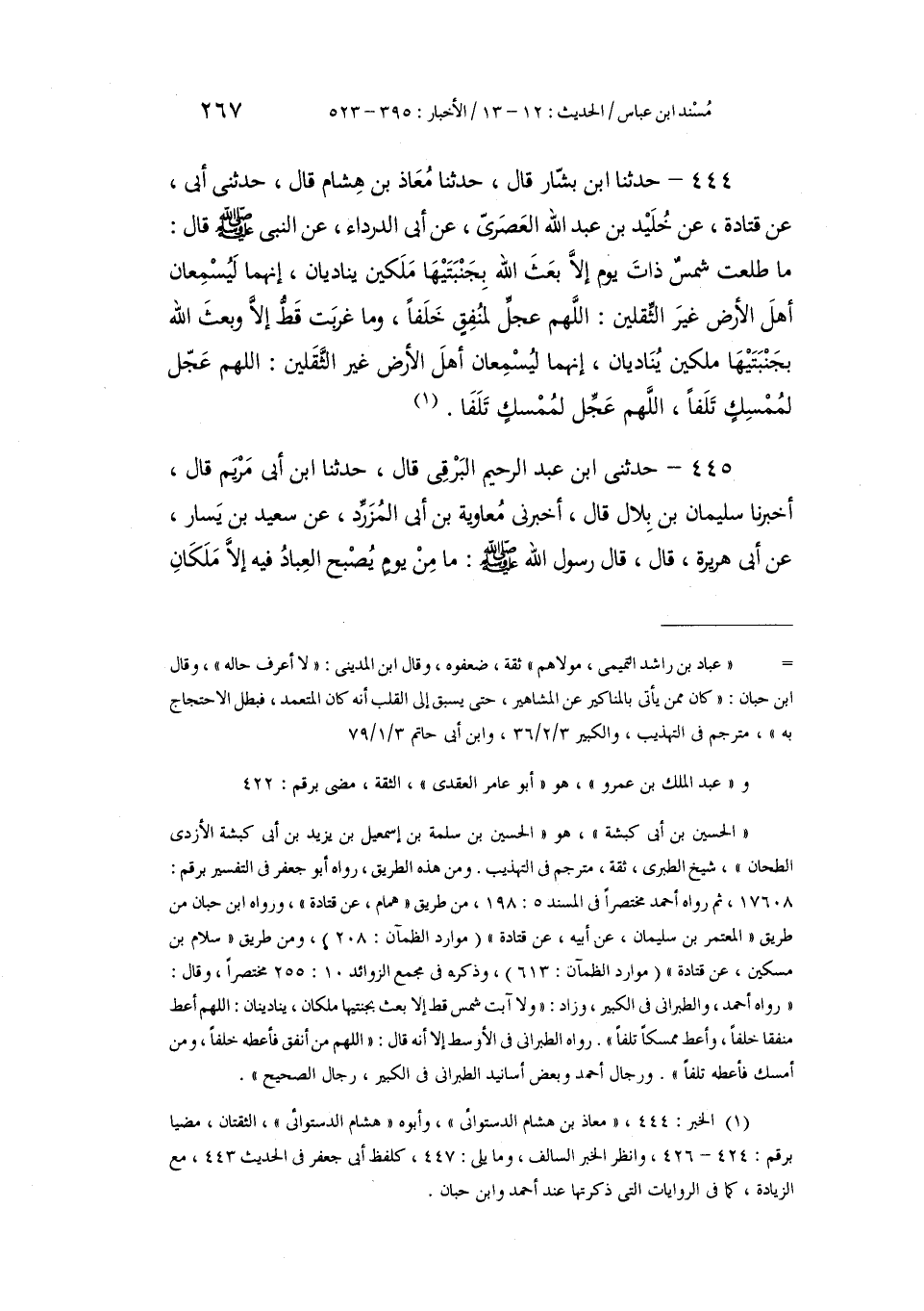 444 - حَدَّثَنَا ابْنُ بَشَّارٍ، قَالَ: حَدَّثَنَا مُعَاذُ بْنُ هِشَامٍ، قَالَ: حَدَّثَنِي أَبِي، عَنْ قَتَادَةَ، عَنْ خُلَيْدِ بْنِ عَبْدِ اللَّهِ الْعَصَرِيِّ، عَنْ أَبِي الدَّرْدَاءِ، عَنِ النَّبِيِّ صَلَّى اللهُ عَلَيْهِ وَسَلَّمَ، قَالَ: " §مَا طَلَعَتْ شَمْسُ ذَاتِ يَوْمٍ إِلَّا بُعِثَ اللَّهُ بِجَنْبَتَيْهَا مَلَكَيْنِ يُنَادِيَانِ، إِنَّهُمَا لَيُسْمِعَانِ أَهْلَ الْأَرْضِ غَيْرَ الثَّقَلَيْنِ: اللَّهُمَّ عَجِّلْ لِمُنْفِقٍ خَلَفًا، وَمَا غَرَبَتْ قَطُّ إِلَّا وَبَعَثَ اللَّهُ بِجَنْبَتَيْهَا مَلَكَيْنِ يُنَادِيَانِ، إِنَّهُمَا لَيُسْمِعَانِ أَهْلَ الْأَرْضِ غَيْرَ الثَّقَلَيْنِ: اللَّهُمَّ عَجِّلْ لِمُمْسِكٍ تَلَفًا، اللَّهُمَّ عَجِّلْ لِمُمْسِكٍ تَلَفًا "