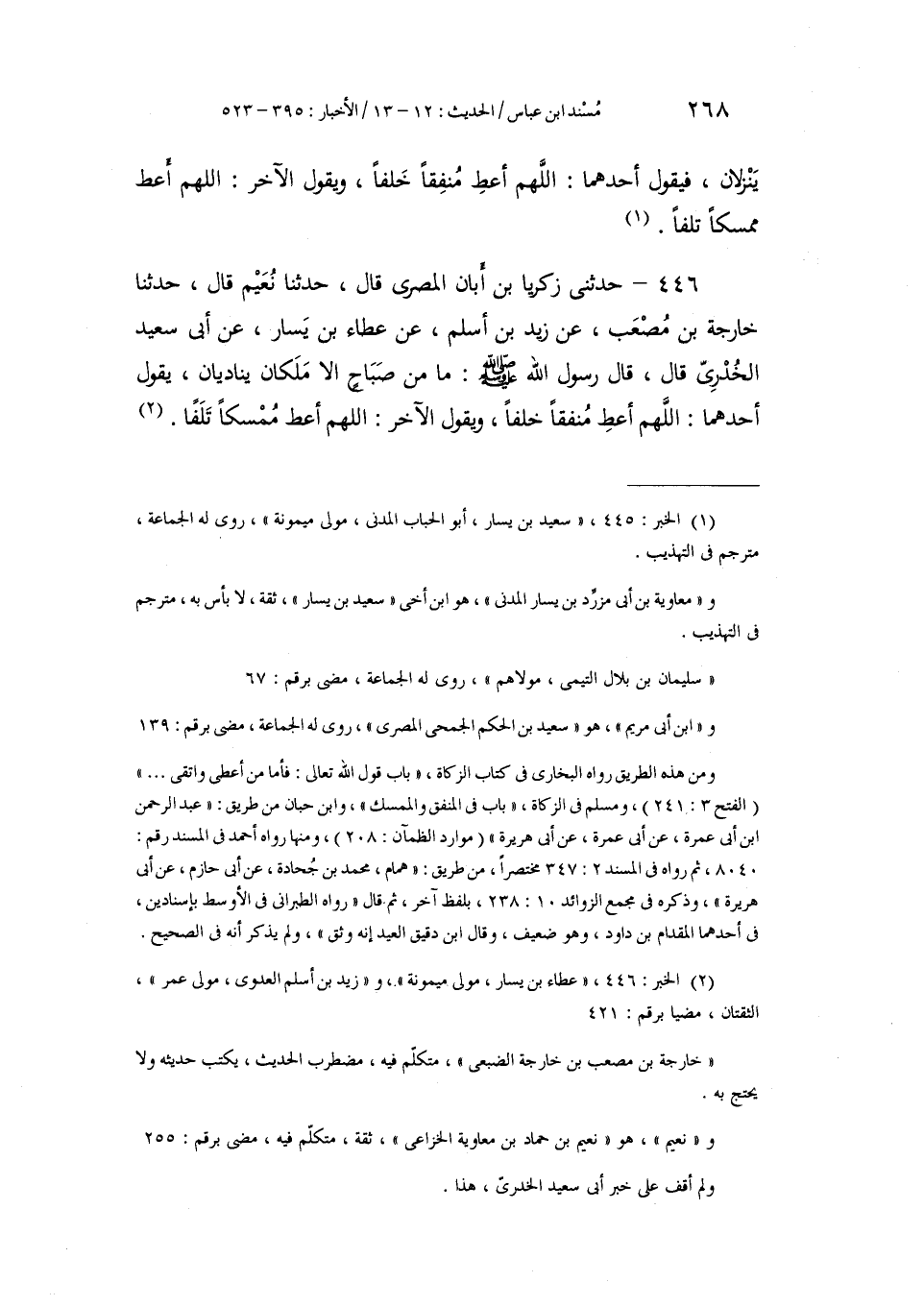 446 - حَدَّثَنِي زَكَرِيَّا بْنُ أَبَانَ الْمِصْرِيُّ، قَالَ: حَدَّثَنَا نُعَيْمٌ، قَالَ: حَدَّثَنَا خَارِجَةُ بْنُ مُصْعَبٍ، عَنْ زَيْدِ بْنِ أَسْلَمَ، عَنْ عَطَاءِ بْنِ يَسَارٍ، عَنْ أَبِي سَعِيدٍ الْخُدْرِيِّ، قَالَ: قَالَ رَسُولُ اللَّهِ صَلَّى اللهُ عَلَيْهِ وَسَلَّمَ: " §مَا مِنْ صَبَاحٍ إِلَّا مَلَكَانِ يُنَادِيَانِ، يَقُولُ أَحَدُهُمَا: اللَّهُمَّ أَعْطِ مُنْفِقًا خَلَفًا، وَيَقُولُ الْآخَرُ: اللَّهُمَّ أَعْطِ مُمْسِكًا تَلَفًا "