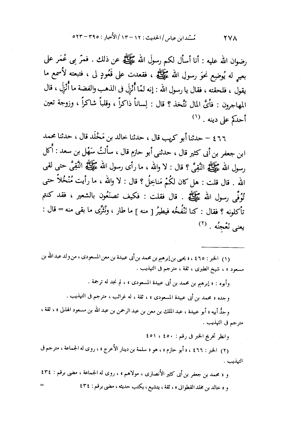 466 - حَدَّثَنَا أَبُو كُرَيْبٍ، قَالَ: حَدَّثَنَا خَالِدُ بْنُ مَخْلَدٍ، قَالَ: حَدَّثَنَا مُحَمَّدُ بْنُ جَعْفَرِ بْنِ أَبِي كَثِيرٍ، قَالَ: حَدَّثَنِي أَبُو حَازِمٍ، قَالَ: سَأَلْتُ سَهْلَ بْنَ سَعْدٍ: §أَكَلَ رَسُولُ اللَّهِ صَلَّى اللهُ عَلَيْهِ وَسَلَّمَ النَّقِيَّ؟ قَالَ: لَا وَاللَّهِ، مَا رَأَى رَسُولُ اللَّهِ صَلَّى اللهُ عَلَيْهِ وَسَلَّمَ النَّقِيَّ حَتَّى لَقِيَ اللَّهَ، قَالَ: قُلْتُ: هَلْ كَانَ لَكُمْ مَنَاخِلُ؟ قَالَ: لَا وَاللَّهِ، مَا رَأَيْتُ مُنْخُلًا حَتَّى تُوُفِّيَ رَسُولُ اللَّهِ صَلَّى اللهُ عَلَيْهِ وَسَلَّمَ، قَالَ: فَقُلْتُ: فَكَيْفَ تَصْنَعُونَ بِالشَّعِيرِ، فَقَدْ كُنْتُمْ تَأْكُلُونَهُ؟ فَقَالَ: «كُنَّا نَنْفُخُهُ فَيَطِيرُ مِنْهُ مَا طَارَ، وَنُثَرِّي مَا بَقِيَ مِنْهُ» ، قَالَ: يَعْنِي نَعْجِنُهُ