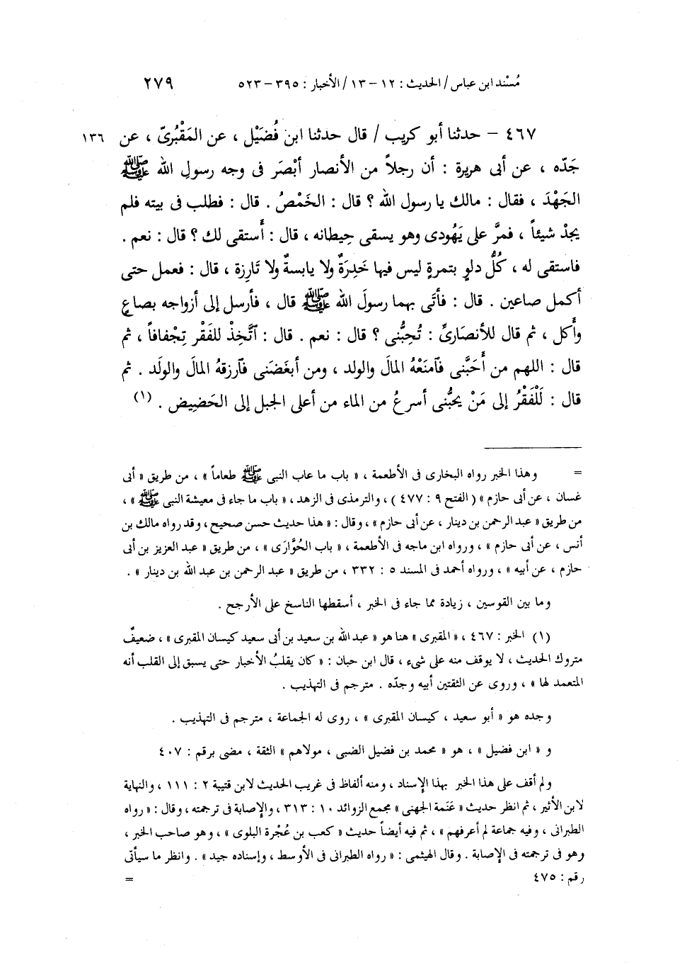 467 - حَدَّثَنَا أَبُو كُرَيْبٍ، قَالَ: حَدَّثَنَا ابْنُ فُضَيْلٍ، عَنِ الْمَقْبُرِيِّ، عَنْ جَدِّهِ، عَنْ أَبِي هُرَيْرَةَ أَنَّ رَجُلًا مِنَ الْأَنْصَارِ أَبْصَرَ فِي وَجْهِ رَسُولِ اللَّهِ صَلَّى اللهُ عَلَيْهِ وَسَلَّمَ الْجَهْدَ، فَقَالَ: مَا لَكَ يَا رَسُولَ اللَّهِ؟ قَالَ: «§الْخَمْصُ» ، قَالَ: فَطَلَبَ فِي بَيْتِهِ فَلَمْ يَجِدْ شَيْئًا، فَمَرَّ عَلَى يَهُودِيٍّ وَهُوَ يَسْقِي حِيطَانَهُ، قَالَ: أَسْتَقِي لَكَ؟ قَالَ: نَعَمْ، فَاسْتَقَى لَهُ، كُلَّ دَلْو بِتَمْرَةٍ لَيْسَ فِيهَا خَدِرَةٌ وَلَا يَابِسَةٌ وَلَا تَارِزَةٌ، قَالَ: فَعَمِلَ حَتَّى أَكْمَلَ صَاعَيْنِ، قَالَ: فَأَتَى بِهِمَا رَسُولَ اللَّهِ صَلَّى اللهُ عَلَيْهِ وَسَلَّمَ قَالَ: فَأَرْسَلَ إِلَى أَزْوَاجِهِ بِصَاعٍ وَأَكَلَ، ثُمَّ قَالَ لِلْأَنْصَارِيِّ: «تُحِبُّنِي؟» ، قَالَ: نَعَمْ، قَالَ: «اتَّخِذْ لِلْفَقْرِ تِجْفَافًا» ، ثُمَّ قَالَ: " اللَّهُمَّ مَنْ أَحَبَّنِي فَامْنَعْهُ الْمَالَ وَالْوَلَدَ، وَمَنْ أَبْغَضَنِي فَارْزُقْهُ الْمَالَ وَالْوَلَدَ، ثُمَّ قَالَ: «لَلْفَقْرُ إِلَى مَنْ يُحِبُّنِي أَسْرَعُ مِنَ الْمَاءِ مِنْ أَعْلَى الْجَبَلِ إِلَى الْحَضِيضِ»