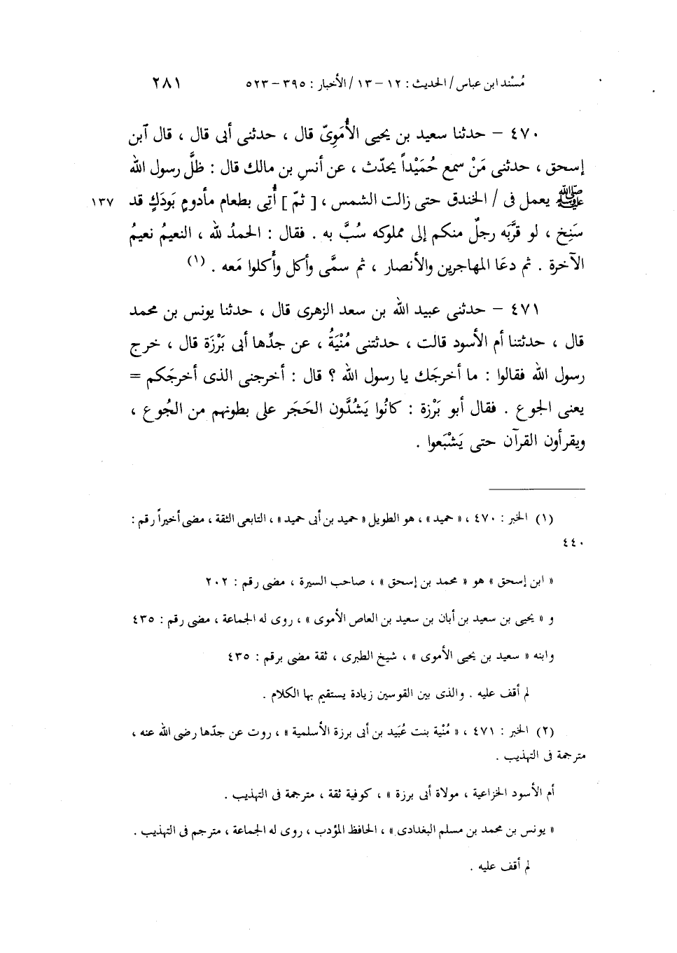 470 - حَدَّثَنَا سَعِيدُ بْنُ يَحْيَى الْأُمَوِيُّ، قَالَ: حَدَّثَنِي أَبِي، قَالَ: قَالَ ابْنُ إِسْحَاقَ، حَدَّثَنِي مِنْ، سَمِعَ حُمَيْدًا، يُحَدِّثُ عَنْ أَنَسِ بْنِ مَالِكٍ، قَالَ: ظَلَّ رَسُولُ اللَّهِ صَلَّى اللهُ عَلَيْهِ وَسَلَّمَ يَعْمَلُ فِي الْخَنْدَقِ حَتَّى زَالَتِ الشَّمْسُ، ثُمَّ أُتِيَ بِطَعَامٍ مَأْدُومٍ بِوَدَكٍ قَدْ سَنِخَ، لَوْ قَرَّبَهُ رَجُلٌ مِنْكُمْ إِلَى مَمْلُوكِهِ سُبُّ بِهِ، فَقَالَ: «§الْحَمْدُ لِلَّهِ، النَّعِيمُ نُعَيْمُ الْآخِرَةِ» ، ثُمَّ دَعَا الْمُهَاجِرِينَ وَالْأَنْصَارَ، ثُمَّ سَمَّى وَأَكَلَ وَأَكَلُوا مَعَهُ