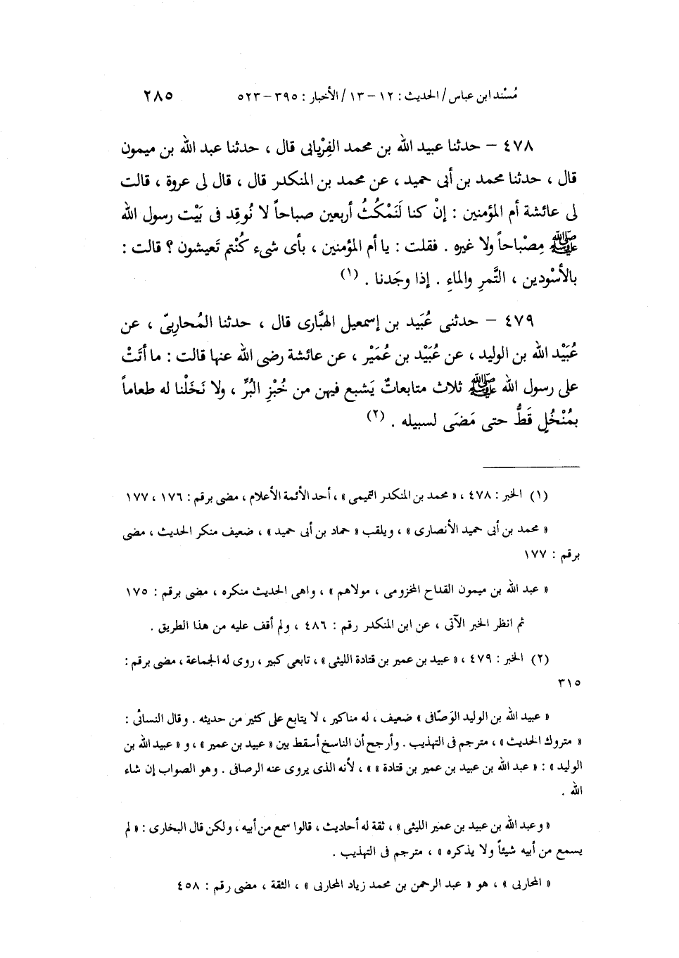 478 - حَدَّثَنَا عُبَيْدُ اللَّهِ بْنُ مُحَمَّدٍ الْفِرْيَابِيُّ، قَالَ: حَدَّثَنَا عَبْدُ اللَّهِ بْنُ مَيْمُونٍ، قَالَ: حَدَّثَنَا مُحَمَّدُ بْنُ أَبِي حُمَيْدٍ، عَنْ مُحَمَّدِ بْنِ الْمُنْكَدِرِ، قَالَ: قَالَ لِي عُرْوَةُ، قَالَتْ لِي عَائِشَةُ أُمُّ الْمُؤْمِنِينَ إِنْ كُنَّا لَنَمْكُثُ أَرْبَعِينَ صَبَاحًا لَا نُوقِدُ فِي بَيْتِ رَسُولِ اللَّهِ صَلَّى اللهُ عَلَيْهِ وَسَلَّمَ مِصْبَاحًا وَلَا غَيْرَهُ، فَقُلْتُ: يَا أُمَّ الْمُؤْمِنِينَ بِأَيِّ شَيْءٍ كُنْتُمْ تَعِيشُونَ؟ قَالَتْ: «§بِالْأَسْوَدَيْنِ، التَّمْرِ وَالْمَاءِ إِذَا وَجَدْنَا»