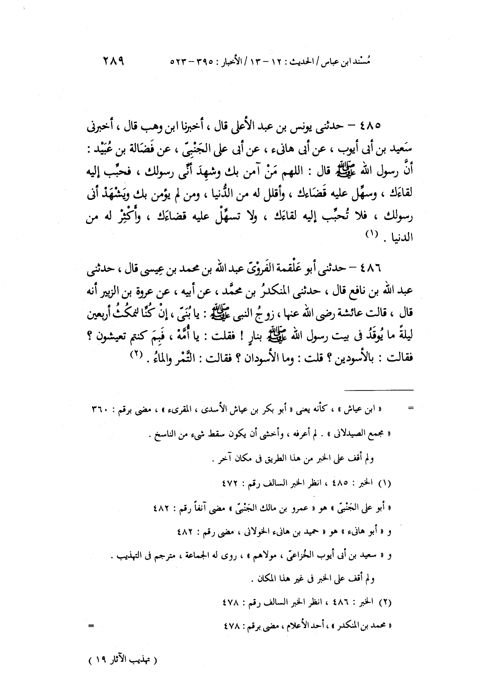 485 - حَدَّثَنِي يُونُسُ بْنُ عَبْدِ الْأَعْلَى، قَالَ: أَخْبَرَنَا ابْنُ وَهْبٍ، قَالَ: أَخْبَرَنِي سَعِيدُ بْنُ أَبِي أَيُّوبَ، عَنْ أَبِي هَانِئٍ، عَنْ أَبِي عَلِيٍّ الْجَنْبِيِّ، عَنْ فَضَالَةَ بْنِ عُبَيْدٍ أَنَّ رَسُولَ اللَّهِ صَلَّى اللهُ عَلَيْهِ وَسَلَّمَ قَالَ: «§اللَّهُمَّ مَنْ آمَنَ بِكَ وَشَهِدَ أَنِّي رَسُولُكَ، فَحَبِّبْ إِلَيْهِ لِقَاءَكَ، وَسَهِّلْ عَلَيْهِ قَضَاءَكَ، وَأَقْلِلْ لَهُ مِنَ الدُّنْيَا، وَمَنْ لَمْ يُؤْمِنْ بِكَ وَيَشْهَدْ أَنِّي رَسُولُكَ، فَلَا تُحَبِّبُ إِلَيْهِ لِقَاءَكَ، وَلَا تُسَهِّلْ عَلَيْهِ قَضَاءَكَ، وَأَكْثِرْ لَهُ مِنَ الدُّنْيَا»