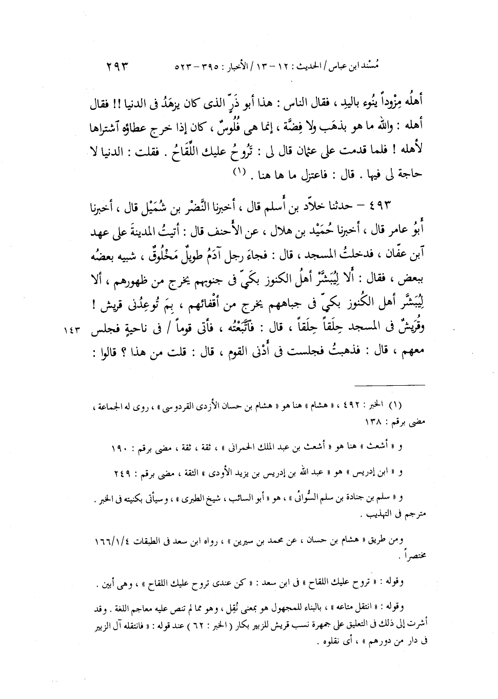 493 - حَدَّثَنَا خَلَّادُ بْنُ أَسْلَمَ، قَالَ: أَخْبَرَنَا النَّضْرُ بْنُ شُمَيْلٍ، قَالَ: أَخْبَرَنَا أَبُو عَامِرٍ، قَالَ: أَخْبَرَنَا حُمَيْدُ بْنُ هِلَالٍ، عَنِ الْأَحْنَفِ، قَالَ: أَتَيْتُ الْمَدِينَةَ عَلَى عَهْدِ ابْنِ عَفَّانَ، فَدَخَلْتُ الْمَسْجِدَ، قَالَ: فَجَاءَ رَجُلٌ آدَمُ طَوِيلٌ مَخْلُوقٌ شَبِيهٌ بَعْضُهُ بِبَعْضٍ، فَقَالَ: «§أَلَا لِيُبَشَّرْ أَهْلُ الْكُنُوزِ بِكَيٍّ فِي جُنُوبِهِمْ يَخْرُجُ مِنْ ظُهُورِهِمْ، أَلَا لِيُبَشَّرْ أَهْلُ الْكُنُوزِ بِكَيٍّ فِي جِبَاهِهِمْ يَخْرُجُ مِنْ أَقْفَائِهِمْ، بِمَ تُوعِدُنِي قُرَيْشٌ» ، وَقُرَيْشٌ فِي الْمَسْجِدِ حِلَقًا حِلَقًا، قَالَ: فَاتَّبَعْتُهُ، فَأَتَى قَوْمًا فِي نَاحِيَةٍ فَجَلَسَ مَعَهُمْ، قَالَ: فَذَهَبْتُ فَجَلَسْتُ فِي أَدْنَى الْقَوْمِ، قَالَ: قُلْتُ مَنْ هَذَا؟ قَالُوا -[294]-: كَأَنَّكَ غَرِيبٌ، قَالَ: قُلْتُ: أَجَلْ، قَالُوا: هَذَا أَبُو ذَرٍّ، قَالَ: قُلْتُ فِي نَفْسِي: مَا كَانَ لِيَجْتَرِئَ عَلَى هَذَا إِلَّا رَجُلٌ لَهُ نَحْوٌ