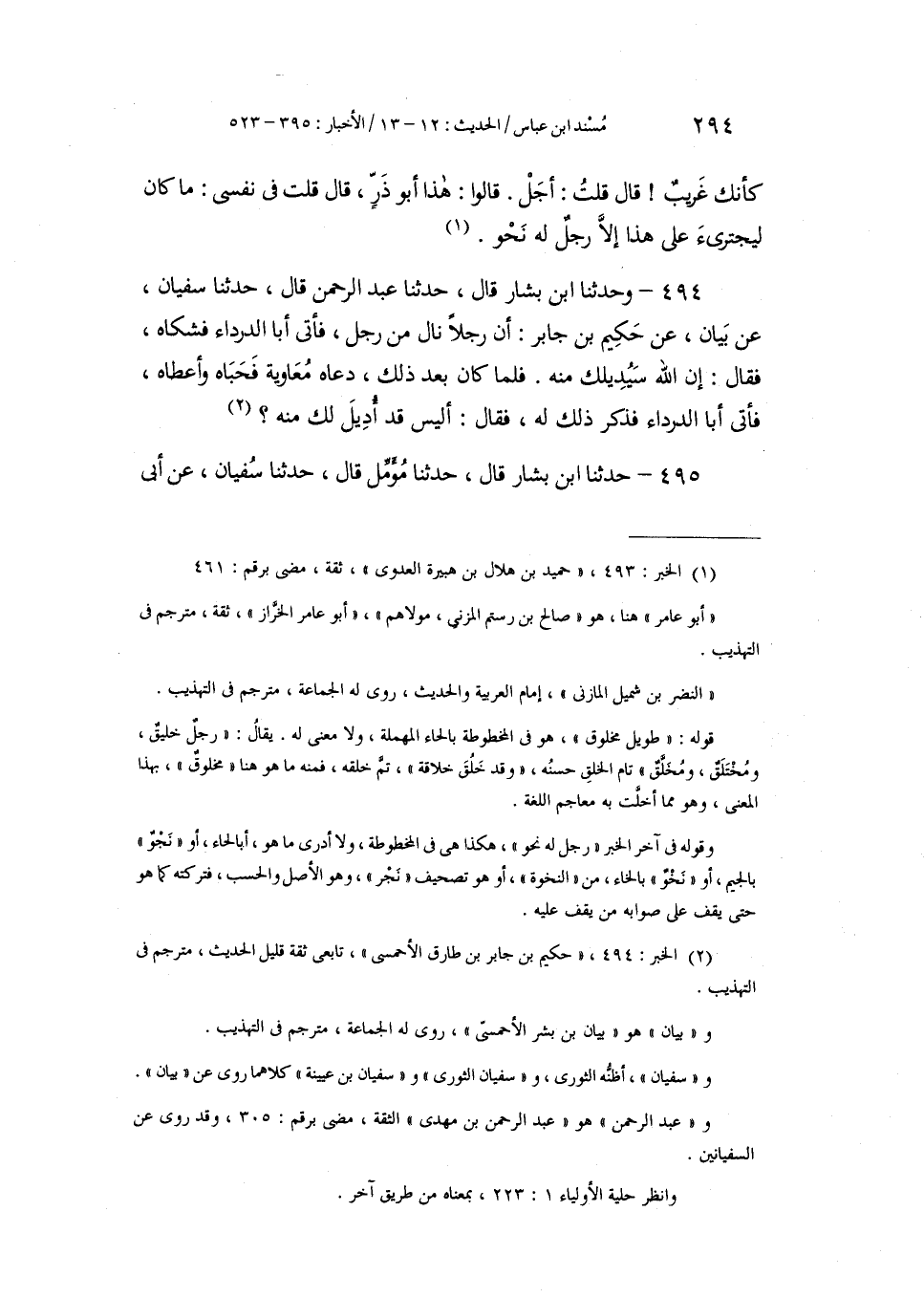 494 - وَحَدَّثَنَا ابْنُ بَشَّارٍ، قَالَ: حَدَّثَنَا عَبْدُ الرَّحْمَنِ، قَالَ: حَدَّثَنَا سُفْيَانُ، عَنْ بَيَانٍ، عَنْ حَكِيمِ بْنِ جَابِرٍ أَنَّ رَجُلًا نَالَ مِنْ رَجُلٍ، فَأَتَى أَبَا الدَّرْدَاءِ فَشَكَاهُ، فَقَالَ: إِنَّ اللَّهَ سَيُدِيلُكَ مِنْهُ فَلَمَّا كَانَ بَعْدَ ذَلِكَ، دَعَاهُ مُعَاوِيَةُ فَحَبَاهُ وَأَعْطَاهُ، فَأَتَى أَبَا الدَّرْدَاءِ فَذَكَرَ ذَلِكَ لَهُ، فَقَالَ: " §أَلَيْسَ قَدْ أُدِيلَ لَكَ مِنْهُ