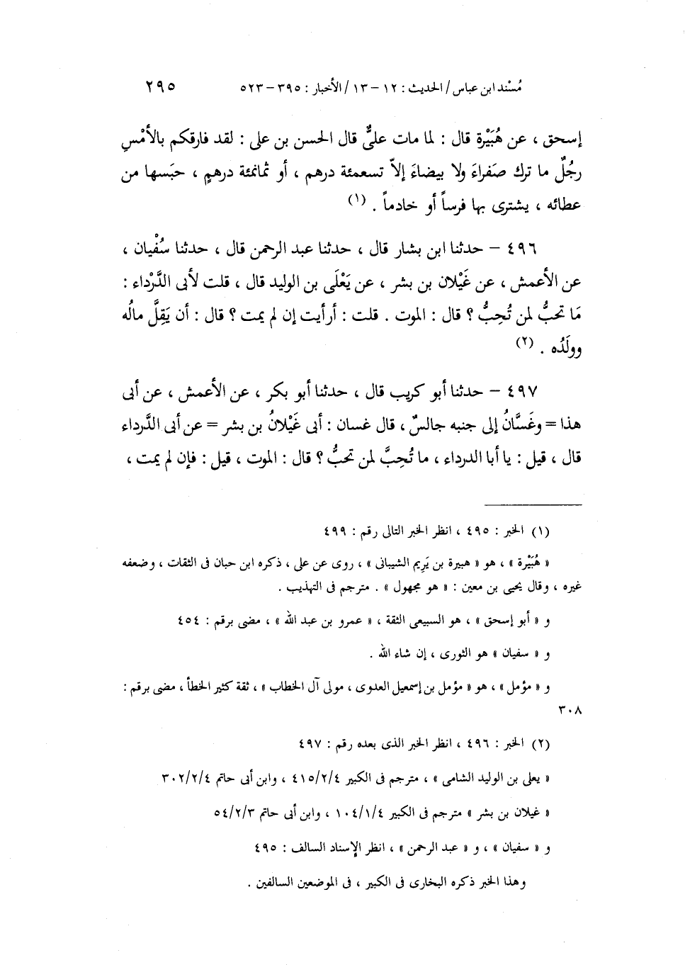 497 - حَدَّثَنَا أَبُو كُرَيْبٍ، قَالَ: حَدَّثَنَا أَبُو بَكْرٍ، عَنِ الْأَعْمَشِ، عَنْ أَبِي هَذَا، وَغَسَّانُ، إِلَى جَنْبِهِ جَالِسٌ، قَالَ غَسَّانُ: أَبِي غَيْلَانُ بْنُ بِشْرٍ، عَنْ أَبِي الدَّرْدَاءِ، قَالَ: قِيلَ: يَا أَبَا الدَّرْدَاءِ: §مَا تُحِبُّ لِمَنْ تُحِبُّ؟ قَالَ: «الْمَوْتُ» ، قِيلَ: فَإِنْ لَمْ يَمُتْ -[296]-، قَالَ: «أَنْ يَقِلَّ مَالُهُ وَوَلَدُهُ»