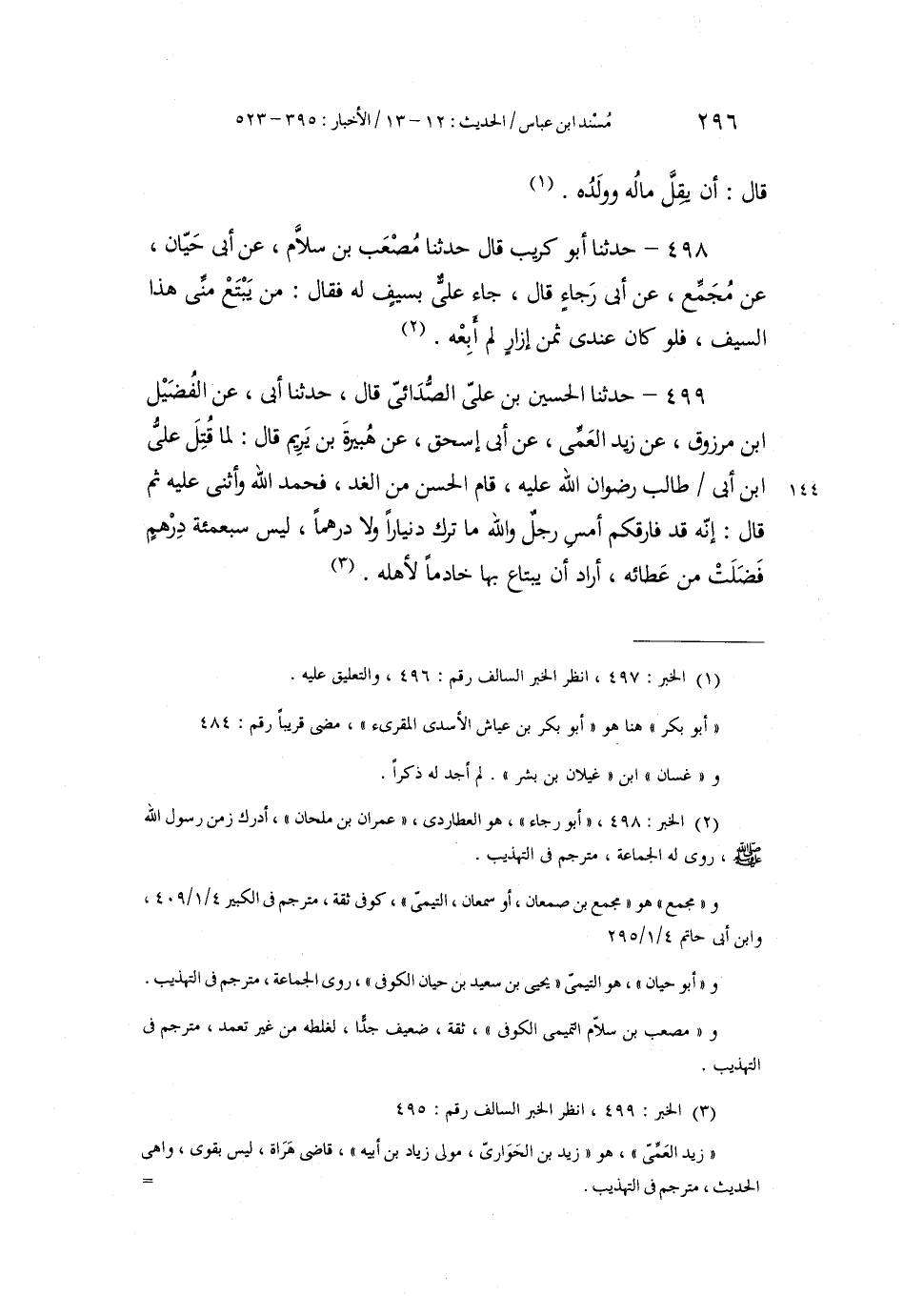 498 - حَدَّثَنَا أَبُو كُرَيْبٍ، قَالَ: حَدَّثَنَا مُصْعَبُ بْنُ سَلَّامٍ، عَنْ أَبِي حَيَّانَ، عَنْ مُجَمِّعٍ، عَنْ أَبِي رَجَاءٍ، قَالَ: جَاءَ عَلِيٌّ بِسَيْفٍ لَهُ، فَقَالَ: «§مَنْ يَبْتَعْ مِنِّي هَذَا السَّيْفَ، فَلَوْ كَانَ عِنْدِي ثَمَنُ إِزَارٍ لَمْ أَبِعْهُ»