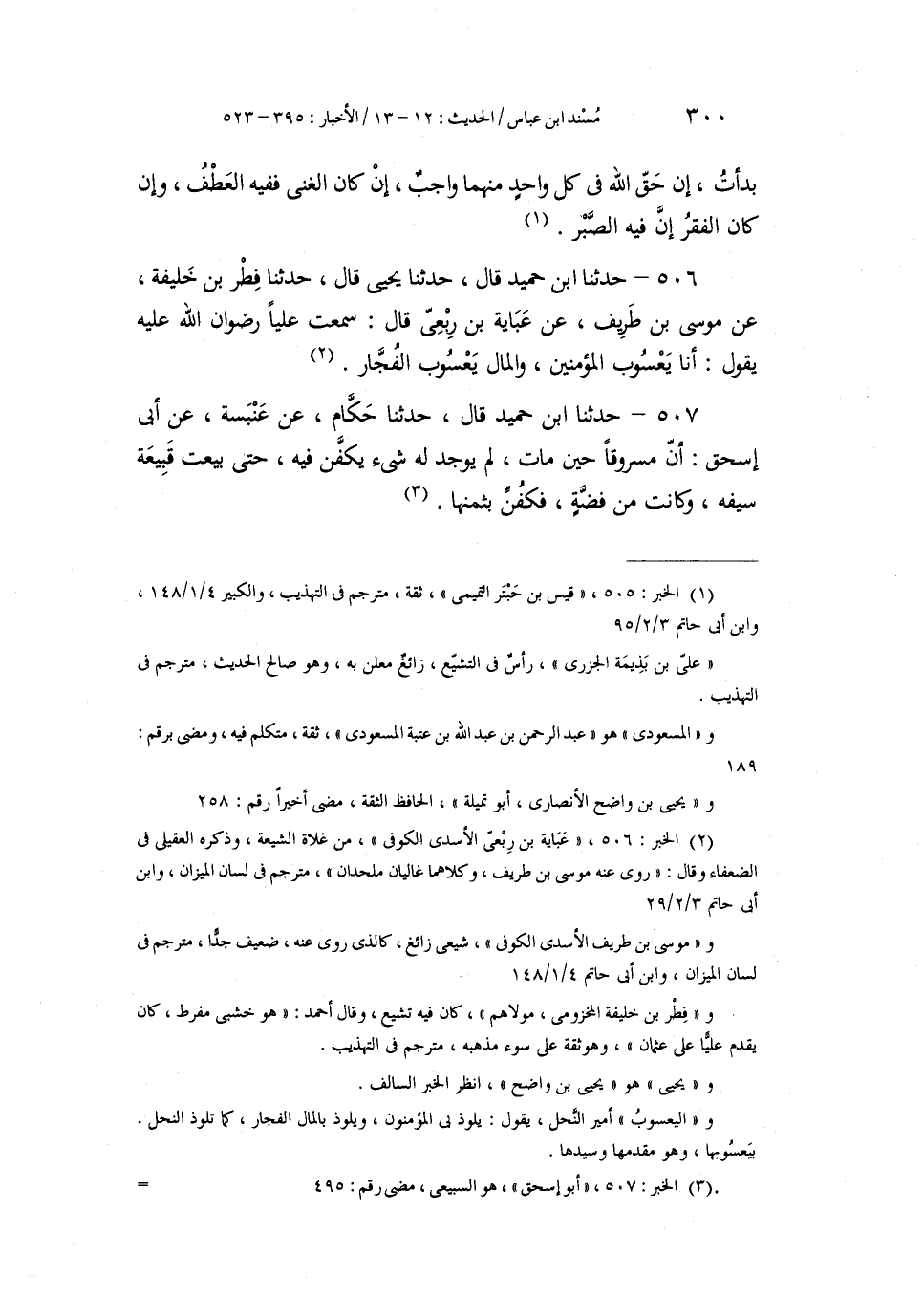 506 - حَدَّثَنَا ابْنُ حُمَيْدٍ، قَالَ: حَدَّثَنَا يَحْيَى، قَالَ: حَدَّثَنَا فِطْرُ بْنُ خَلِيفَةَ، عَنْ مُوسَى بْنِ طَرِيفٍ، عَنْ عَبَايَةَ بْنِ رِبْعِيٍّ، قَالَ: سَمِعْتُ عَلِيًّا، رِضْوَانُ اللَّهِ عَلَيْهِ، يَقُولُ: «§أَنَا يَعْسُوبُ الْمُؤْمِنِينَ وَالْمَالُ يَعْسُوبُ الْفُجَّارِ»