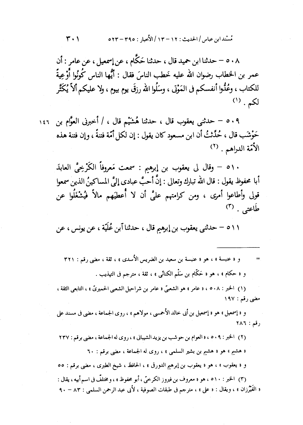 508 - حَدَّثَنَا ابْنُ حُمَيْدٍ، قَالَ: حَدَّثَنَا حَكَّامٌ، عَنْ إِسْمَاعِيلَ، عَنْ عَامِرٍ، أَنَّ عُمَرَ بْنَ الْخَطَّابِ، رِضْوَانُ اللَّهِ عَلَيْهِ خَطَبَ النَّاسَ، فَقَالَ: «أَيُّهَا النَّاسُ §كُونُوا أَوْعِيَةً لِلْكِتَابِ، وَعُدُّوا أَنْفُسَكُمْ فِي الْمَوْتَى، وَسَلُوا اللَّهَ رِزْقَ يَوْمٍ بِيَوْمٍ، وَلَا عَلَيْكُمْ أَلَّا يُكَثَّرَ لَكُمْ»