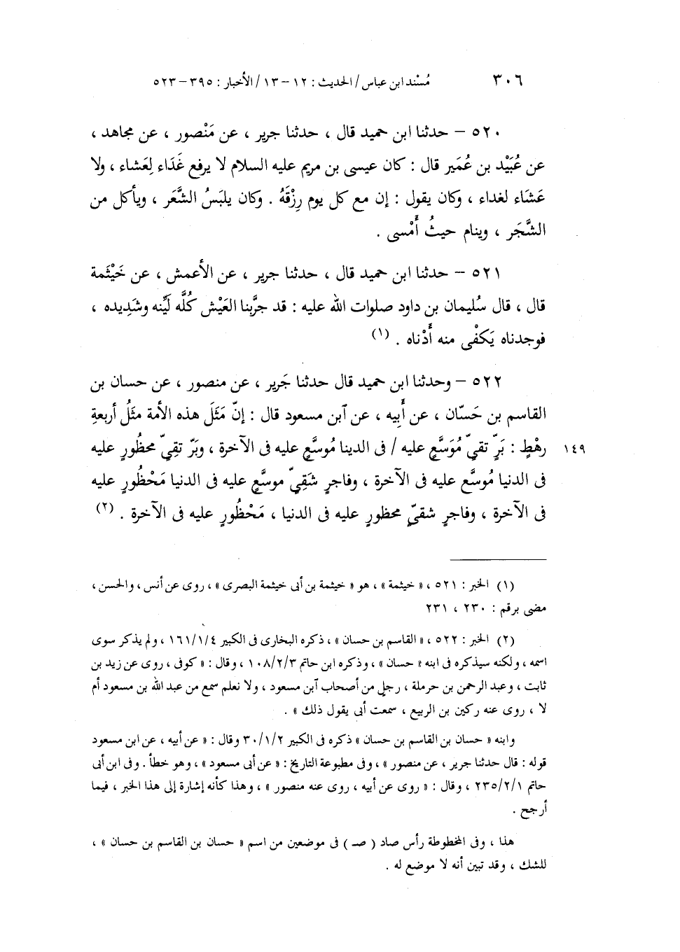 522 - وَحَدَّثَنَا ابْنُ حُمَيْدٍ، قَالَ: حَدَّثَنَا جَرِيرٌ، عَنْ مَنْصُورٍ، عَنْ حَسَّانَ بْنِ الْقَاسِمِ بْنِ حَسَّانَ، عَنْ أَبِيهِ، عَنِ ابْنِ مَسْعُودٍ، قَالَ: " إِنَّ §مَثَلَ هَذِهِ الْأُمَّةِ مِثْلُ أَرْبَعَةِ رَهْطٍ: بَرٌّ تَقِيٌّ مُوَسَّعٌ عَلَيْهِ فِي الدُّنْيَا مُوَسَّعٌ عَلَيْهِ فِي الْآخِرَةِ، وَبَرٌّ تَقِيٌّ مَحْظُورٌ عَلَيْهِ فِي الدُّنْيَا مُوَسَّعٌ عَلَيْهِ فِي الْآخِرَةِ، وَفَاجِرٌ شَقِيٌّ مُوَسَّعٌ عَلَيْهِ فِي الدُّنْيَا مَحْظُورٌ عَلَيْهِ فِي الْآخِرَةِ، وَفَاجِرٌ شَقِيٌّ مَحْظُورٌ عَلَيْهِ فِي الدُّنْيَا، مَحْظُورٌ عَلَيْهِ فِي الْآخِرَةِ "