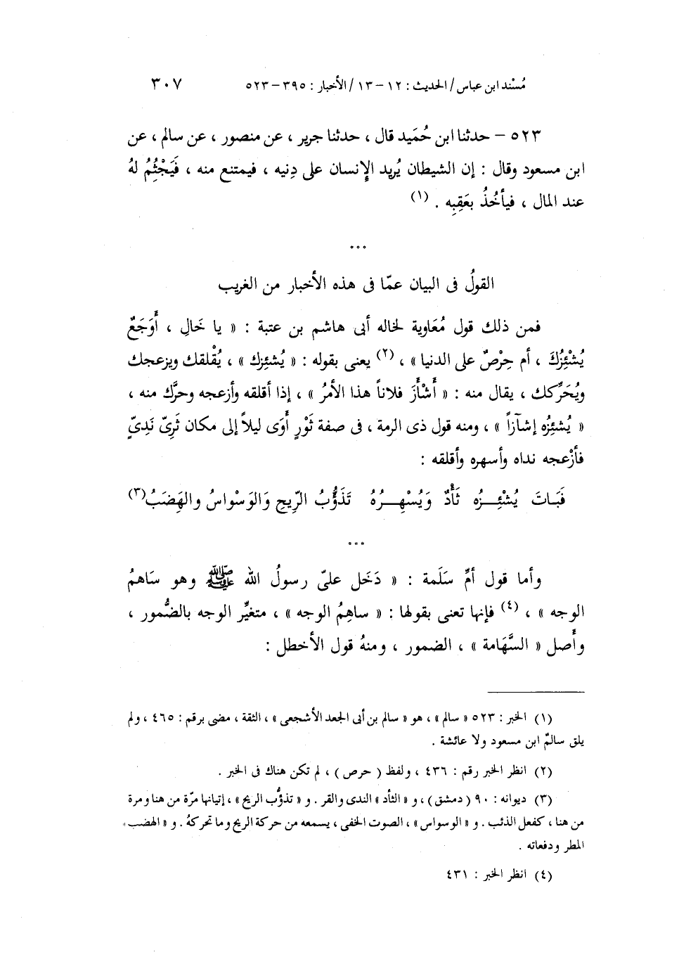 523 - حَدَّثَنَا ابْنُ حُمَيْدٍ، قَالَ: حَدَّثَنَا جَرِيرٌ، عَنْ مَنْصُورٍ، عَنْ سَالِمٍ، عَنِ ابْنِ مَسْعُودٍ، وَقَالَ: «إِنَّ §الشَّيْطَانَ يُرِيدُ الْإِنْسَانَ عَلَى دِينِهِ، فَيَمْتِنِعُ مِنْهُ، فَيَجْثُمُ لَهُ عِنْدَ الْمَالِ، فَيَأْخُذُ بِعَقِبِهِ»