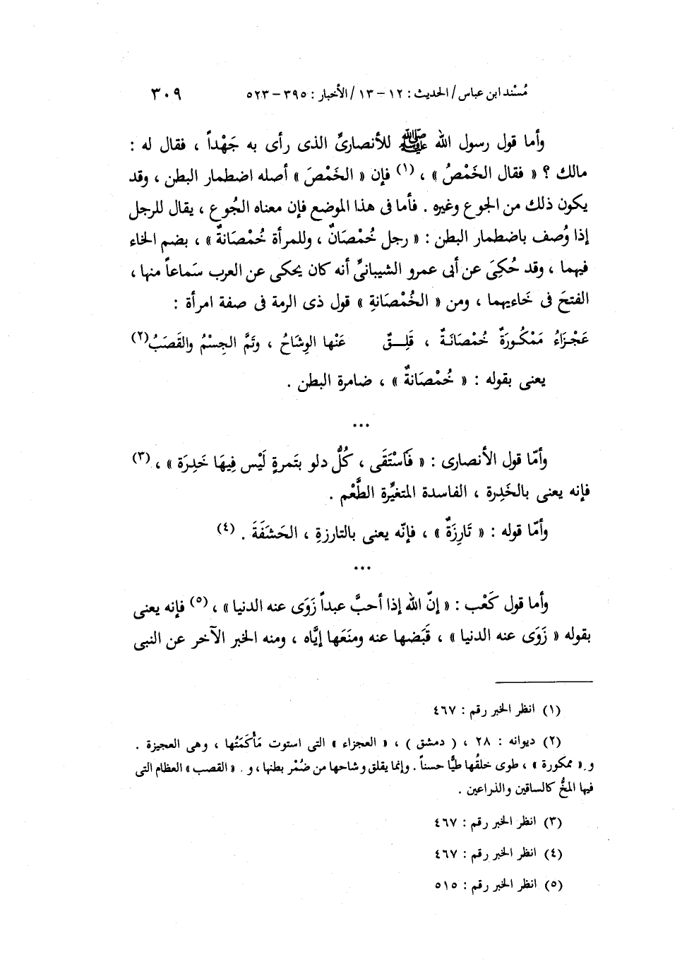 يَعْنِي بِقَوْلِهِ: «خُمْصَانَةٌ» ضَامِرَةُ الْبَطْنِ وَأَمَّا قَوْلُ الْأَنْصَارِيِّ: فَاسْتَقَى كُلُّ دَلْو بِتَمْرَةٍ لَيْسَ فِيهَا خَدِرَةٌ: فَإِنَّهُ يَعْنِي بِالْخَدِرَةِ، الْفَاسِدَةَ الْمُتَغَيِّرَةَ الطَّعْمِ. وَأَمَّا قَوْلُهُ: «تَارِزَةً» فَإِنَّهُ يَعْنِي بِالتَّارِزَةِ: الْحَشَفَةَ وَأَمَّا قَوْلُ كَعْبٍ: إِنَّ اللَّهِ إِذَا أَحَبَّ عَبْدًا زَوَى عَنْهُ الدُّنْيَا: فَإِنَّهُ يَعْنِي بِقَوْلِهِ زَوَى عَنْهُ الدُّنْيَا: قَبَضَهَا عَنْهُ وَمَنَعَهَا إِيَّاهُ، وَمِنْهُ الْخَبَرُ الْآخَرُ عَنِ النَّبِيِّ صَلَّى اللهُ عَلَيْهِ وَسَلَّمَ