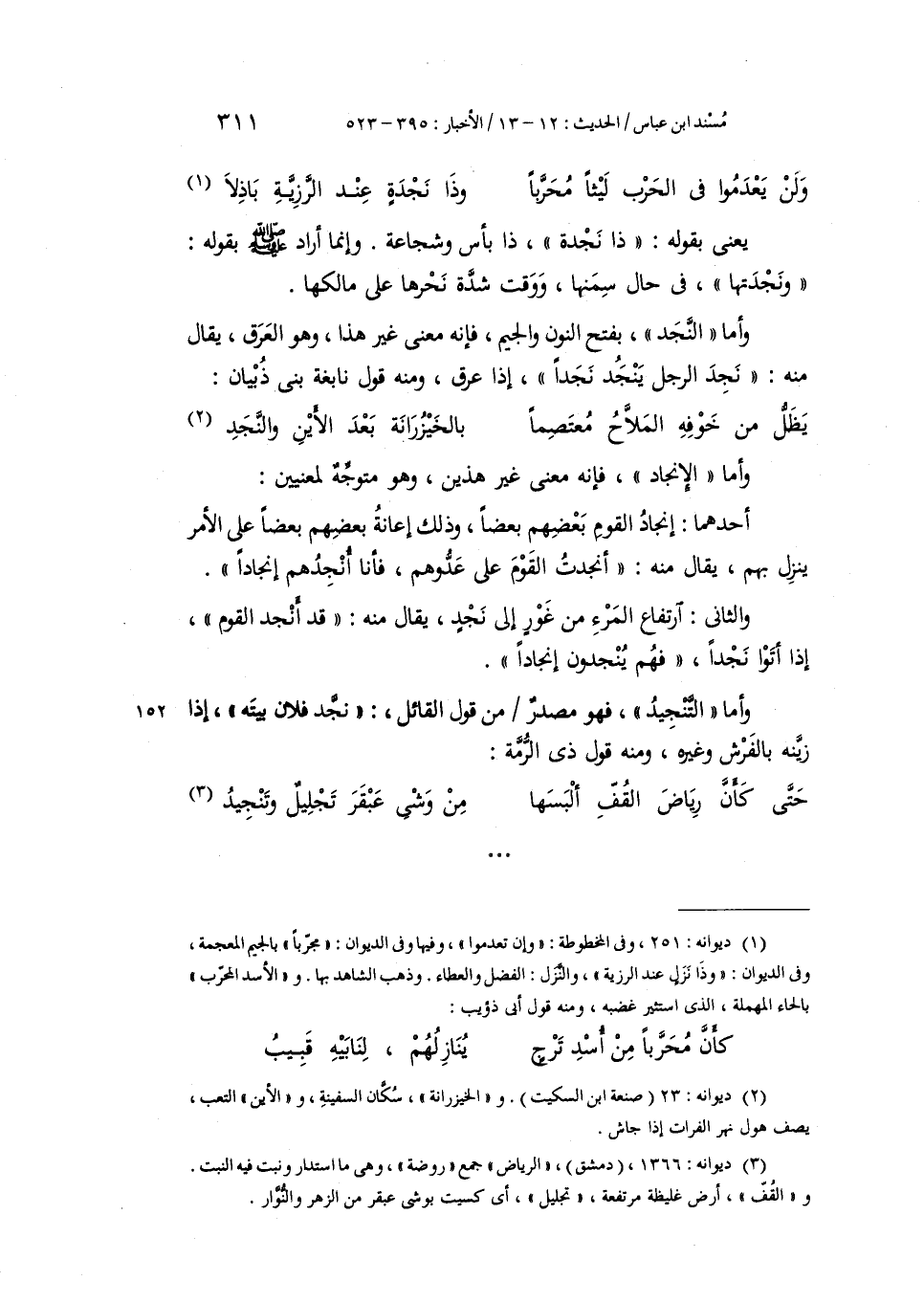 وَأَمَّا الْإِنْجَادُ فَإِنَّهُ مَعْنًى غَيْرُ هَذَيْنِ، وَهُوَ مُتَوَجِّهٌ لِمَعْنَيَيْنِ: أَحَدُهُمَا: إِنْجَادُ الْقَوْمِ بَعْضُهُمْ بَعْضًا، وَذَلِكَ إِعَانَةُ بَعْضِهِمْ بَعْضًا عَلَى الْأَمْرِ يَنْزِلُ بِهِمْ، يُقَالُ مِنْهُ: أَنْجَدْتُ الْقَوْمَ عَلَى عَدُوِّهِمْ، فَأَنَا أُنْجِدُهُمْ إِنْجَادًا وَالثَّانِي: ارْتِفَاعُ الْمَرْءِ مِنْ غَوْرٍ إِلَى نَجْدٍ، يُقَالُ مِنْهُ: قَدْ أَنْجَدَ الْقَوْمَ، إِذَا أَتَوْا نَجْدًا، فَهُمْ يَنْجِدُونَ إِنْجَادًا. وَأَمَّا التَّنْجِيدُ، فَهُوَ مَصْدَرٌ مِنْ قَوْلِ الْقَائِلِ: نَجَّدَ فُلَانٌ بَيْتَهُ، إِذَا زَيَّنَهُ بِالْفُرُشِ وَغَيْرِهِ، وَمِنْهُ قَوْلُ ذِي الرُّمَّةِ: