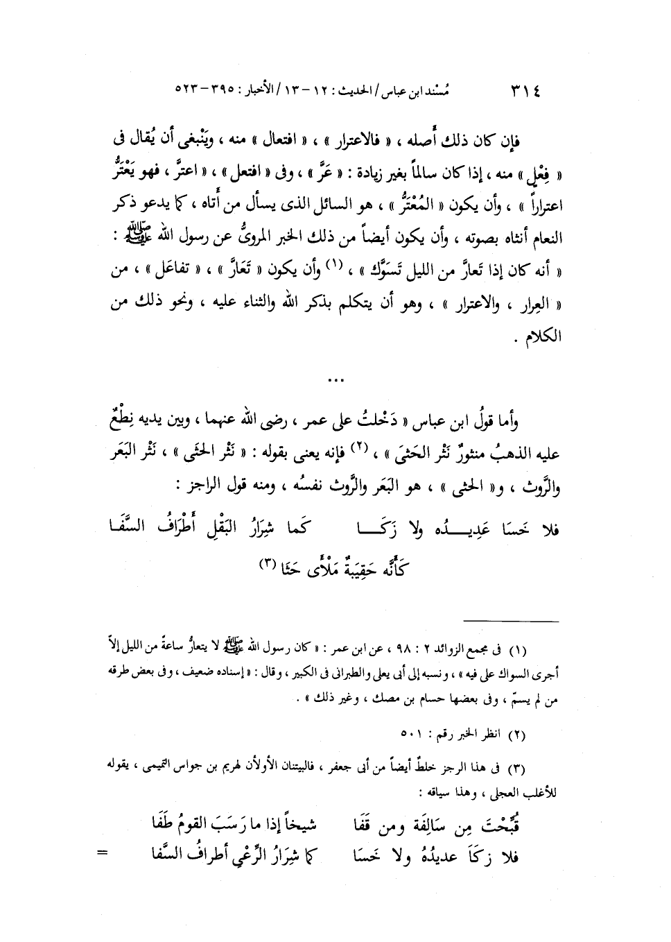 فَإِنْ كَانَ ذَلِكَ أَصْلُهُ: «فَالِاعْتِرَارُ» : افْتِعَالٌ مِنْهُ، وَيَنْبَغِي أَنْ يُقَالَ فِي فِعْلٍ مِنْهُ، إِذَا كَانَ سَالِمًا بِغَيْرِ زِيَادَةٍ: عَرَّ، وَفِي افْتَعَلَ، اعْتَرَّ، فَهُوَ يَعْتَرُّ اعْتِرَارًا، وَأَنْ يَكُونَ الْمُعْتَرُّ، هُوَ السَّائِلُ الَّذِي يَسْأَلُ مَنْ أَتَاهُ، كَمَا يَدْعُو ذَكَرُ النَّعَامِ أُنْثَاهُ بِصَوْتِهِ، وَأَنْ يَكُونَ أَيْضًا مِنْ ذَلِكَ الْخَبَرُ الْمَرْوِيُّ عَنْ رَسُولِ اللَّهِ صَلَّى اللهُ عَلَيْهِ وَسَلَّمَ: أَنَّهُ كَانَ إِذَا تَعَارَّ مِنَ اللَّيْلِ تَسَوَّكَ، وَأَنْ يَكُونَ تَعَارَّ تَفَاعَلَ مِنَ الْعِرَارِ وَالِاعْتِرَارِ وَهُوَ أَنْ يَتَكَلَّمَ بِذِكْرِ اللَّهِ وَالثَّنَاءِ عَلَيْهِ، وَنَحْوِ ذَلِكَ مِنَ الْكَلَامِ، وَأَمَّا قَوْلُ ابْنِ عَبَّاسٍ: دَخَلْتُ عَلَى عُمَرَ رَضِيَ اللَّهُ عَنْهُمَا وَبَيْنَ يَدَيْهِ نِطَعٌ عَلَيْهِ الذَّهَبُ مَنْثُورٌ نَثْرَ الْحَثَى فَإِنَّهُ يَعْنِي بِقَوْلِهِ: نَثْرَ الْحَثَى نَثْرَ الْبَعْرِ وَالرَّوَثِ، وَالْحَثَى هُوَ الْبَعْرُ، وَالرَّوَثُ نَفْسُهُ، وَمِنْهُ قَوْلُ الرَّاجِزِ: