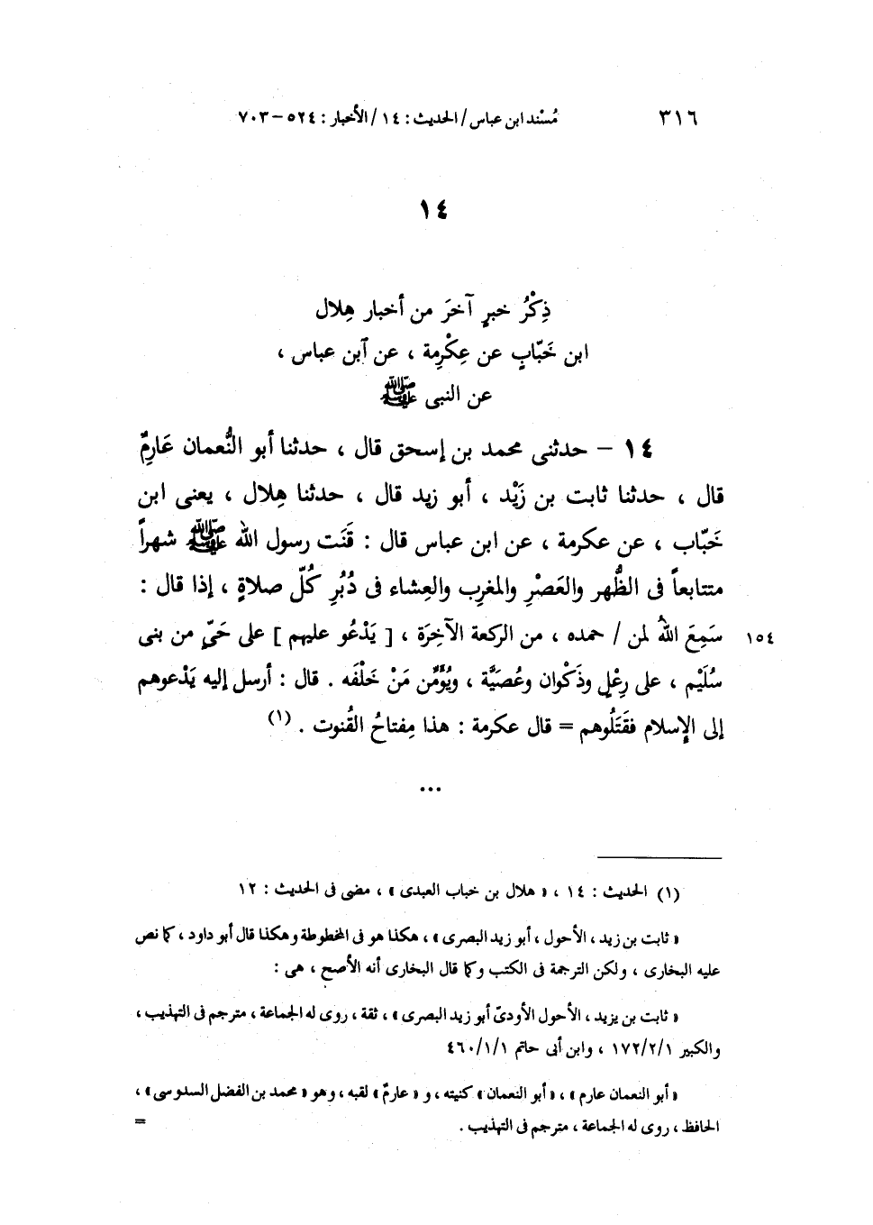 حَدَّثَنِي مُحَمَّدُ بْنُ إِسْحَاقَ، قَالَ: حَدَّثَنَا أَبُو النُّعْمَانِ عَارِمٌ قَالَ: حَدَّثَنَا ثَابِتُ بْنُ زَيْدٍ أَبُو زَيْدٍ، قَالَ: حَدَّثَنَا هِلَالٌ يَعْنِي ابْنَ خَبَّابٍ، عَنْ عِكْرِمَةَ، عَنِ ابْنِ عَبَّاسٍ، قَالَ: قَنَتَ رَسُولُ اللَّهِ صَلَّى اللهُ عَلَيْهِ وَسَلَّمَ شَهْرًا مُتَتَابِعًا فِي الظُّهْرِ وَالْعَصْرِ وَالْمَغْرِبِ وَالْعِشَاءِ فِي دُبُرِ كُلِّ صَلَاةٍ، إِذْ قَالَ: «§سَمِعَ اللَّهُ لِمَنْ حَمِدَهُ» ، مِنَ الرَّكْعَةِ الْآخِرَةِ، يَدْعُو عَلَيْهِمْ عَلَى حَيٍّ مِنْ بَنِي سُلَيْمٍ، عَلَى رِعْلٍ وَذَكْوَانَ وَعُصَيَّةَ، وَيُؤَمِّنُ مَنْ خَلْفَهُ، قَالَ: أَرْسَلَ إِلَيْهِ يَدْعُوهُمْ إِلَى الْإِسْلَامِ فَقَتَلُوهُمْ، قَالَ عِكْرِمَةُ: هَذَا مِفْتَاحُ الْقُنُوتِ -[317]- الْقَوْلُ فِي عِلَلِ هَذَا الْخَبَرِ: وَهَذَا خَبَرٌ صَحِيحٌ عِنْدَنَا سَنَدُهُ، وَقَدْ يَجِبُ أَنْ يَكُونَ عَلَى مَذْهَبِ الْآخَرِينَ سَقِيمًا غَيْرَ صَحِيحٍ، لِعِلَلٍ: إِحْدَاهَا: أَنَّهُ خَبَرٌ لَا يُعْرَفُ لَهُ مَخْرَجٌ يَصِحُّ عَنِ ابْنِ عَبَّاسِ إِلَّا مَنْ هَذَا الْوَجْهِ. وَالثَّانِيَةُ: لِأَنَّهُ مِنْ نَقْلِ عِكْرِمَةَ عَنِ ابْنِ عَبَّاسٍ، وَفِي نَقْلِ عِكْرِمَةَ عِنْدَهُمْ نَظَرٌ يَجِبُ التَّثَبُّتُ فِيهِ مِنْ أَجْلِهِ. وَالثَّالِثَةُ: أَنَّ الْمَعْرُوفَ عَنِ ابْنِ عَبَّاسٍ مِنْ رِوَايَتِهِ الْقُنُوتَ فِي الصُّبْحِ، إِنَّمَا هُوَ عَنْ عُمَرَ رَضِيَ اللَّهُ عَنْهُ، دُونَ الرِّوَايَةِ عَنِ النَّبِيِّ صَلَّى اللهُ عَلَيْهِ وَسَلَّمَ
