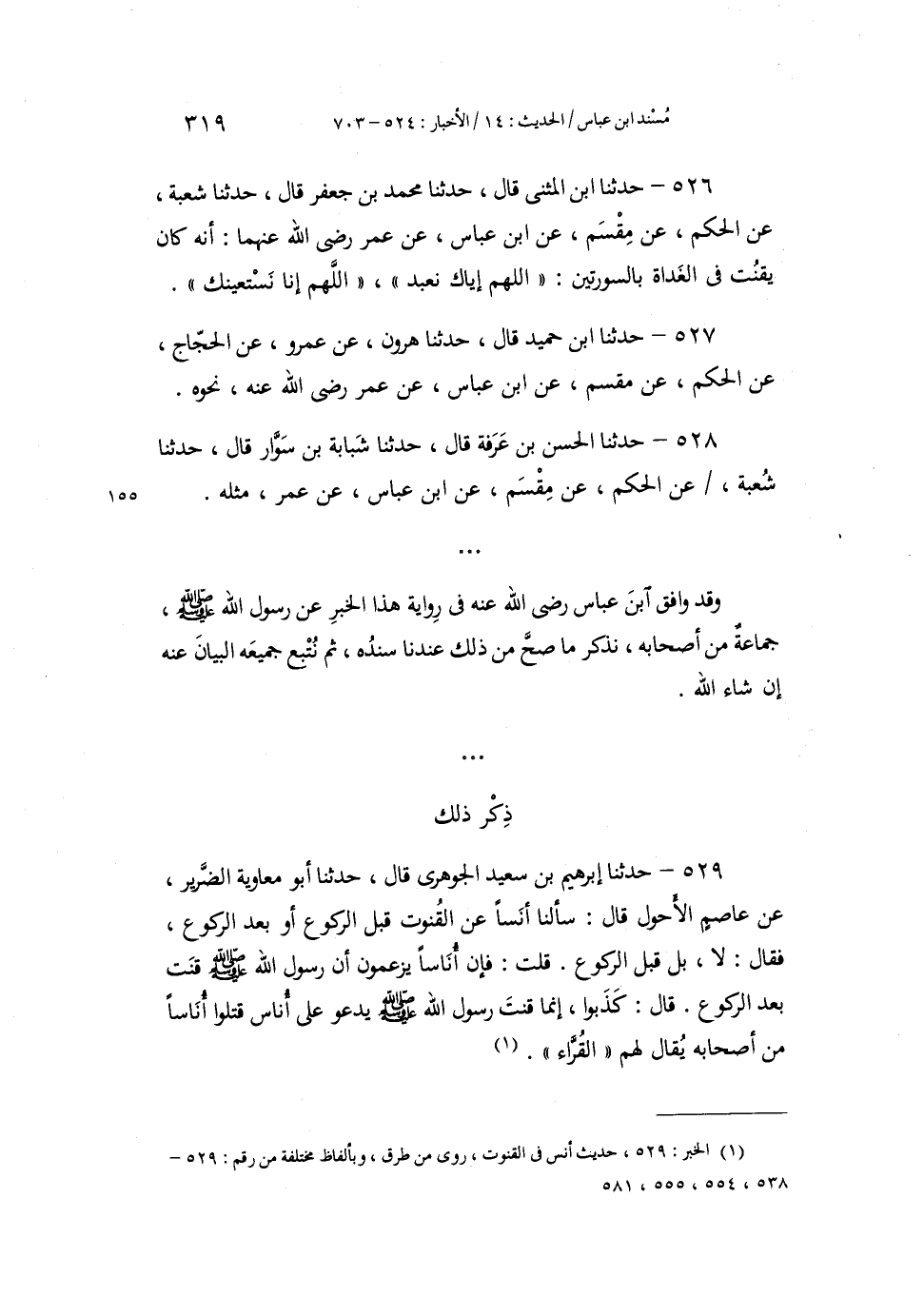 526 - حَدَّثَنَا ابْنُ الْمُثَنَّى، قَالَ: حَدَّثَنَا مُحَمَّدُ بْنُ جَعْفَرٍ، قَالَ: حَدَّثَنَا شُعْبَةُ، عَنِ الْحَكَمِ، عَنْ مِقْسَمٍ، عَنِ ابْنِ عَبَّاسٍ، عَنْ عُمَرَ، رَضِيَ اللَّهُ عَنْهُمَا " أَنَّهُ كَانَ §يَقْنُتُ فِي الْغَدَاةِ بِالسُّورَتَيْنِ: اللَّهُمَّ إِيَّاكَ نَعْبُدُ، اللَّهُمَّ إِنَّا نَسْتَعِينُكَ "