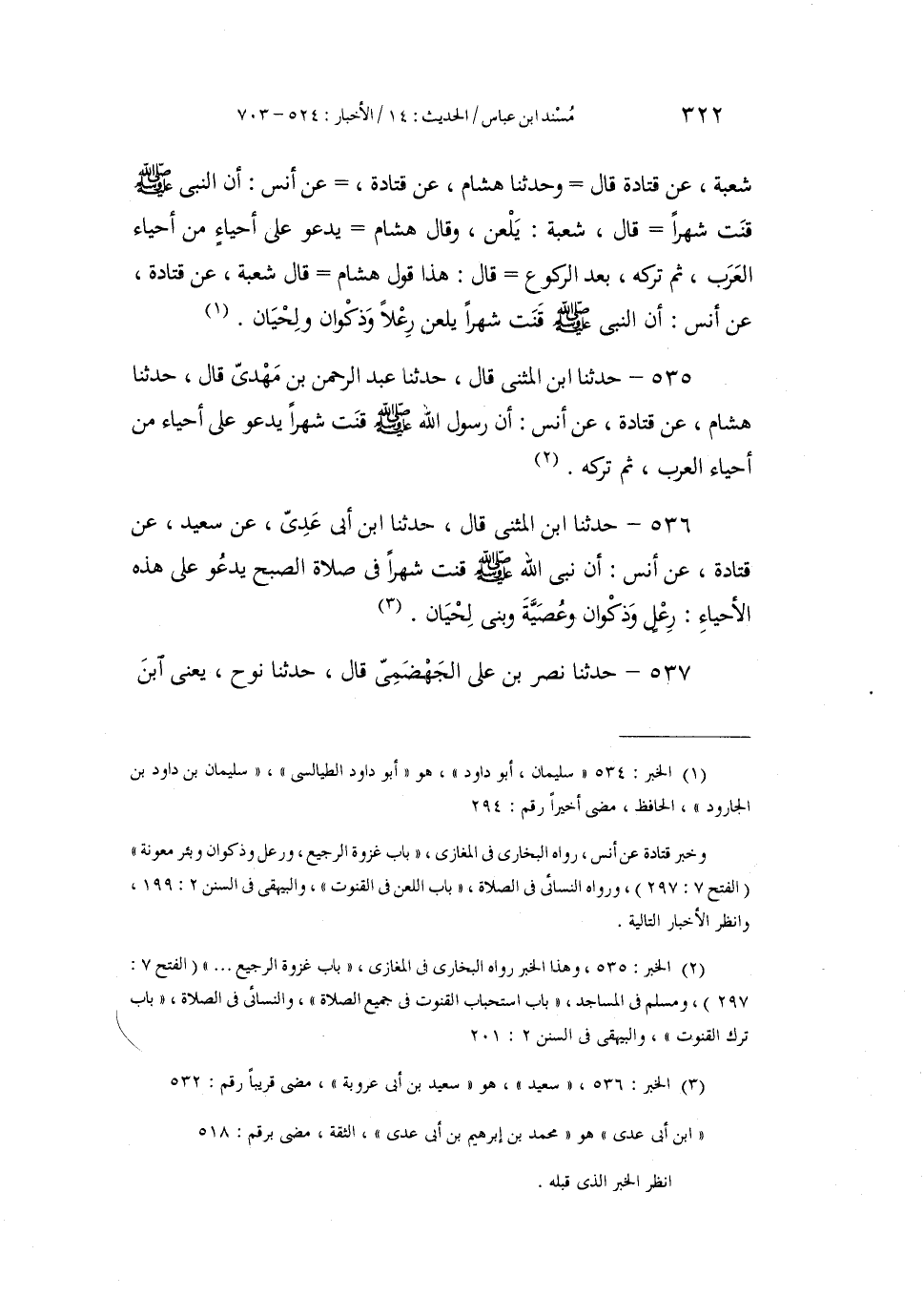 535 - حَدَّثَنَا ابْنُ الْمُثَنَّى، قَالَ: حَدَّثَنَا عَبْدُ الرَّحْمَنِ بْنُ مَهْدِيٍّ، قَالَ: حَدَّثَنَا هِشَامٌ، عَنْ قَتَادَةَ، عَنْ أَنَسٍ أَنَّ رَسُولَ اللَّهِ صَلَّى اللهُ عَلَيْهِ وَسَلَّمَ «§قَنَتَ شَهْرًا يَدْعُو عَلَى أَحْيَاءَ مِنْ أَحْيَاءِ الْعَرَبِ، ثُمَّ تَرَكَهُ»