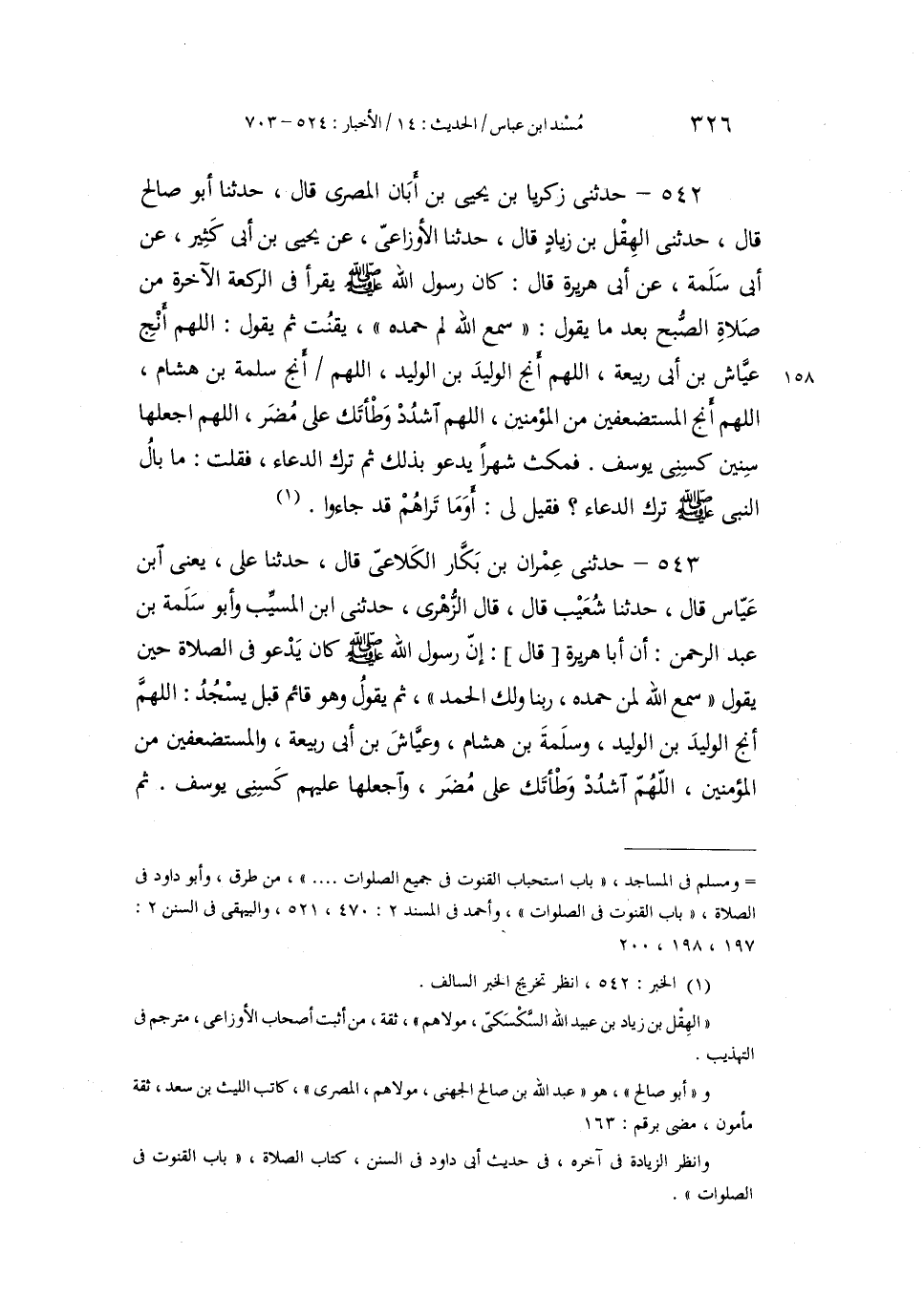 542 - حَدَّثَنِي زَكَرِيَّا بْنُ يَحْيَى بْنِ أَبَانَ الْمِصْرِيُّ، قَالَ: حَدَّثَنَا أَبُو صَالِحٍ، قَالَ: حَدَّثَنِي الْهِقْلُ بْنُ زِيَادٍ، قَالَ: حَدَّثَنَا الْأَوْزَاعِيُّ، عَنْ يَحْيَى بْنِ أَبِي كَثِيرٍ، عَنْ أَبِي سَلَمَةَ، عَنْ أَبِي هُرَيْرَةَ، قَالَ: كَانَ رَسُولُ اللَّهِ صَلَّى اللهُ عَلَيْهِ وَسَلَّمَ يَقْرَأُ فِي الرَّكْعَةِ الْآخِرَةِ مِنْ صَلَاةِ الصُّبْحِ بَعْدَ مَا يَقُولُ: «§سَمِعَ اللَّهُ لِمَنْ حَمِدَهُ» ، يَقْنُتُ، ثُمَّ يَقُولُ: «اللَّهُمَّ أَنْجِ عَيَّاشَ بْنَ أَبِي رَبِيعَةَ، اللَّهُمَّ أَنْجِ الْوَلِيدَ بْنَ الْوَلِيدِ، اللَّهُمَّ أَنْجِ سَلَمَةَ بْنَ هِشَامٍ، اللَّهُمَّ أَنْجِ الْمُسْتَضْعَفِينَ مِنَ الْمُؤْمِنِينَ، اللَّهُمَّ اشْدُدْ وَطْأَتَكَ عَلَى مُضَرَ، اللَّهُمَّ اجْعَلْهَا سِنِينَ كَسِنِي يُوسُفَ» فَمَكَثَ شَهْرًا يَدْعُو بِذَلِكَ ثُمَّ تَرَكَ الدُّعَاءَ، فَقُلْتُ: مَا بَالُ النَّبِيِّ صَلَّى اللهُ عَلَيْهِ وَسَلَّمَ تَرَكَ الدُّعَاءَ؟ فَقِيلَ لِي: أَوَمَا تَرَاهُمْ قَدْ جَاءُوا