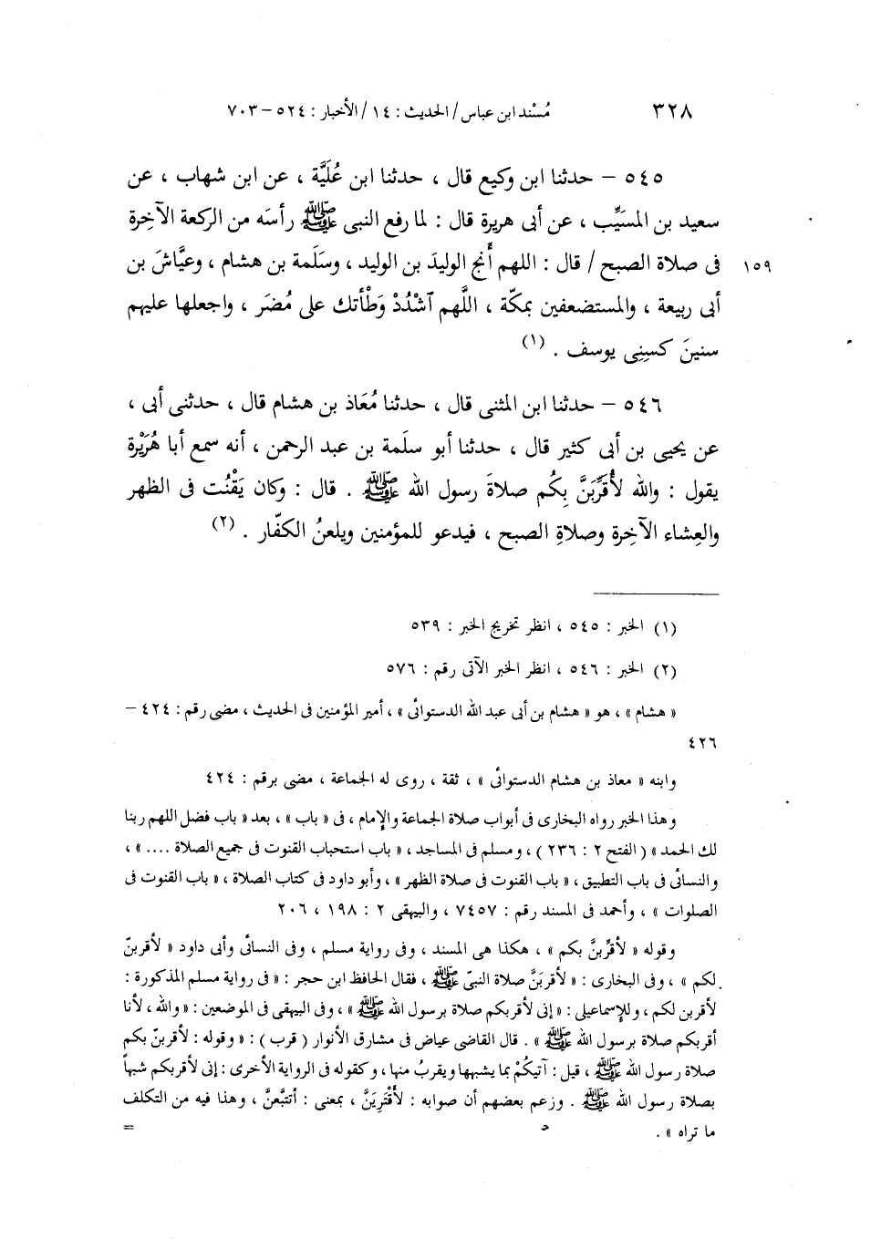 546 - حَدَّثَنَا ابْنُ الْمُثَنَّى، قَالَ: حَدَّثَنَا مُعَاذُ بْنُ هِشَامٍ، قَالَ: حَدَّثَنِي أَبِي، عَنْ يَحْيَى بْنِ أَبِي كَثِيرٍ، قَالَ: حَدَّثَنَا أَبُو سَلَمَةَ بْنُ عَبْدِ الرَّحْمَنِ، أَنَّهُ سَمِعَ أَبَا هُرَيْرَةَ، يَقُولُ: وَاللَّهِ لَأُقَرِّبَنَّ بِكُمْ صَلَاةَ رَسُولِ اللَّهِ صَلَّى اللهُ عَلَيْهِ وَسَلَّمَ قَالَ: وَكَانَ «§يَقْنُتُ فِي الظُّهْرِ وَالْعِشَاءِ الْآخِرَةِ وَصَلَاةِ الصُّبْحِ، فَيَدْعُو لِلْمُؤْمِنِينَ وَيَلْعَنُ الْكُفَّارَ»