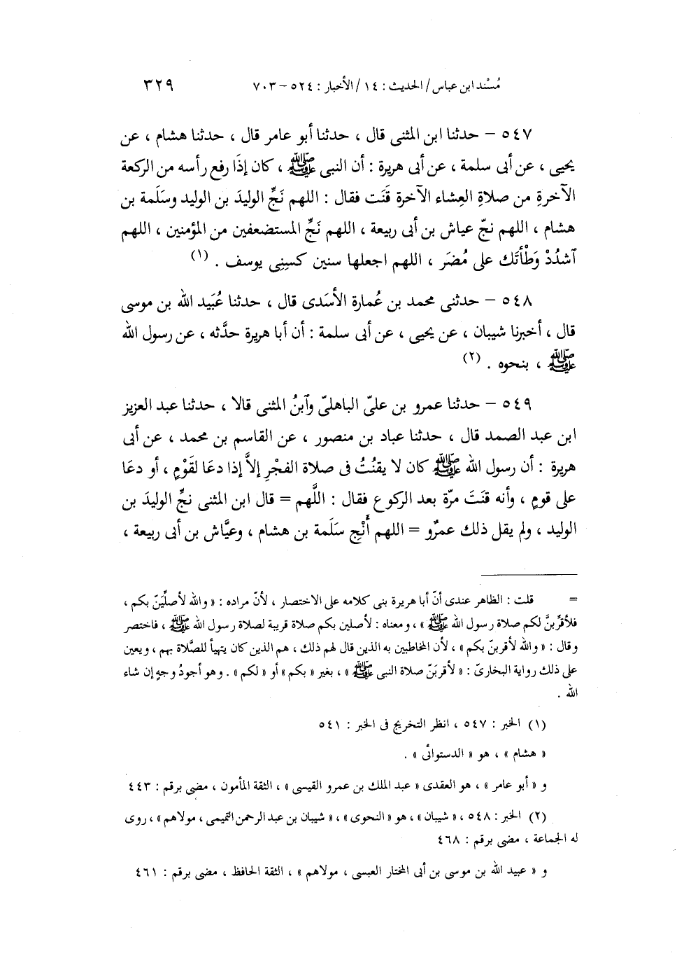 547 - حَدَّثَنَا ابْنُ الْمُثَنَّى، قَالَ: حَدَّثَنَا أَبُو عَامِرٍ، قَالَ: حَدَّثَنَا هِشَامٌ، عَنْ يَحْيَى، عَنْ أَبِي سَلَمَةَ، عَنْ أَبِي هُرَيْرَةَ أَنَّ النَّبِيَّ صَلَّى اللهُ عَلَيْهِ وَسَلَّمَ كَانَ إِذَا رَفَعَ رَأْسَهُ مِنَ الرَّكْعَةِ الْآخِرَةِ مِنْ صَلَاةِ الْعِشَاءِ الْآخِرَةِ قَنَتَ، فَقَالَ: «§اللَّهُمَّ نَجِّ الْوَلِيدَ بْنَ الْوَلِيدِ، وَسَلَمَةَ بْنَ هِشَامٍ، اللَّهُمَّ نَجِّ عَيَّاشَ بْنَ أَبِي رَبِيعَةَ، اللَّهُمَّ نَجِّ الْمُسْتَضْعَفِينَ مِنَ الْمُؤْمِنِينَ، اللَّهُمَّ اشْدُدْ وَطْأَتَكَ عَلَى مُضَرَ، اللَّهُمَّ اجْعَلْهَا سِنِينَ كَسِنِي يُوسُفَ»