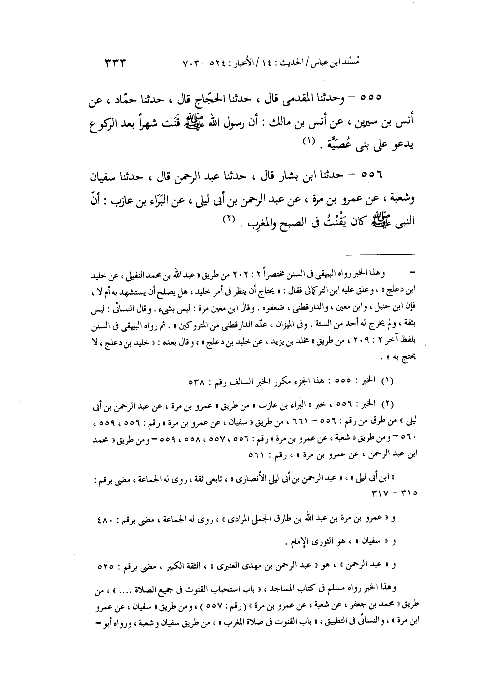 556 - حَدَّثَنَا ابْنُ بَشَّارٍ، قَالَ: حَدَّثَنَا عَبْدُ الرَّحْمَنِ، قَالَ: حَدَّثَنَا سُفْيَانُ، وَشُعْبَةَ، عَنْ عَمْرِو بْنِ مُرَّةَ، عَنْ عَبْدِ الرَّحْمَنِ بْنِ أَبِي لَيْلَى، عَنِ الْبَرَاءِ بْنِ عَازِبٍ أَنَّ النَّبِيَّ صَلَّى اللهُ عَلَيْهِ وَسَلَّمَ «كَانَ §يَقْنُتُ فِي الصُّبْحِ وَالْمَغْرِبِ»
