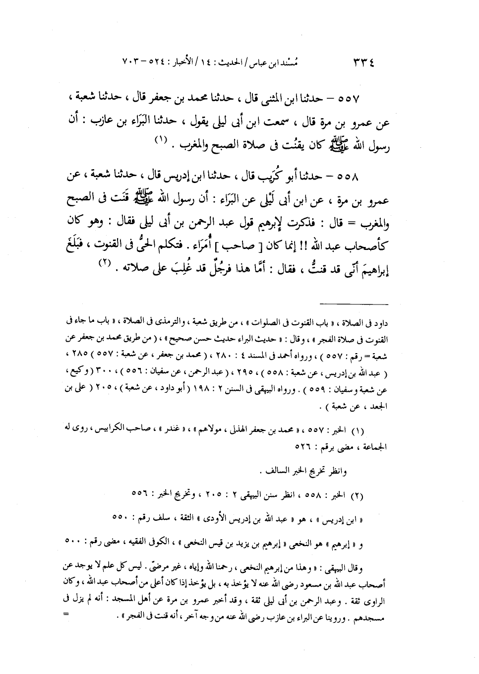 558 - حَدَّثَنَا أَبُو كُرَيْبٍ، قَالَ: حَدَّثَنَا ابْنُ إِدْرِيسَ، قَالَ: حَدَّثَنَا شُعْبَةُ، عَنْ عَمْرِو بْنِ مُرَّةَ، عَنِ ابْنِ أَبِي لَيْلَى، عَنِ الْبَرَاءِ أَنَّ رَسُولَ اللَّهِ صَلَّى اللهُ عَلَيْهِ وَسَلَّمَ «§قَنَتَ فِي الصُّبْحِ وَالْمَغْرِبِ» ، قَالَ: فَذَكَرْتُ لِإِبْرَاهِيمَ قَوْلَ عَبْدِ الرَّحْمَنِ بْنِ أَبِي لَيْلَى، فَقَالَ: وَهُوَ كَانَ كَأَصْحَابِ عَبْدِ اللَّهِ إِنَّمَا كَانَ صَاحَبَ أُمَرَاءَ، فَتَكَلَّمَ الْحَيُّ فِي الْقُنُوتِ، فَبَلَغَ إِبْرَاهِيمَ أَنِّي قَدْ قَنَتُّ، فَقَالَ: أَمَّا هَذَا فَرَجُلٌ قَدْ غُلِبَ عَلَى صَلَاتِهِ