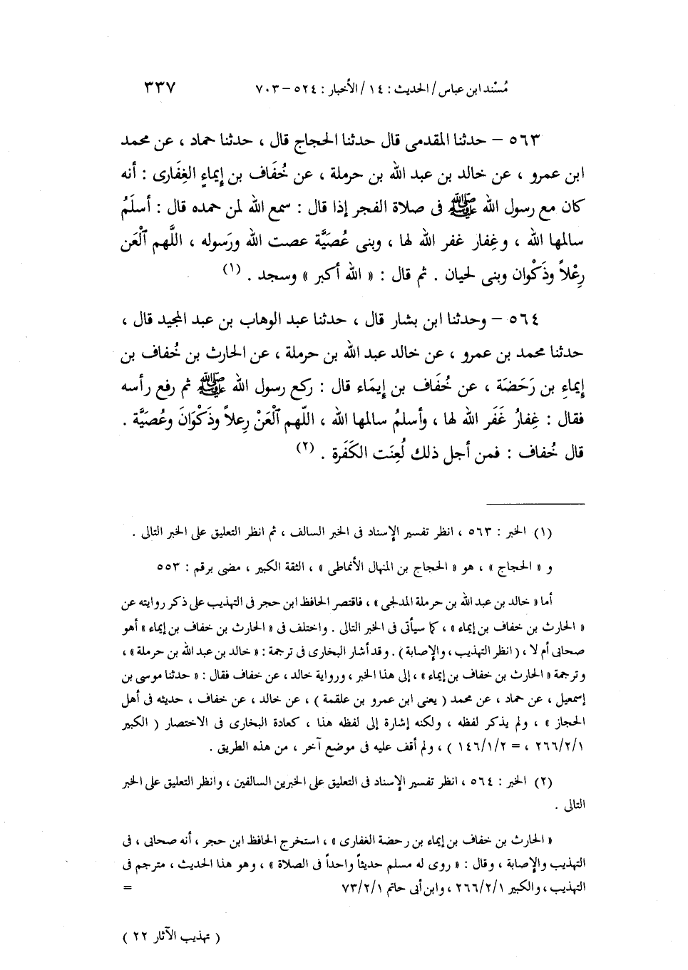563 - حَدَّثَنَا الْمُقَدَّمِيُّ، قَالَ: حَدَّثَنَا الْحَجَّاجُ، قَالَ: حَدَّثَنَا حَمَّادٌ، عَنْ مُحَمَّدِ بْنِ عَمْرٍو، عَنْ خَالِدِ بْنِ عَبْدِ اللَّهِ بْنِ حَرْمَلَةَ، عَنْ خُفَافِ بْنِ إِيمَاءٍ الْغِفَارِيِّ أَنَّهُ كَانَ مَعَ رَسُولِ اللَّهِ صَلَّى اللهُ عَلَيْهِ وَسَلَّمَ فِي صَلَاةِ الْفَجْرِ إِذَا قَالَ: «§سَمِعَ اللَّهُ لِمَنْ حَمِدَهُ» ، قَالَ: «أَسْلَمُ سَالَمَهَا اللَّهُ، وَغِفَارٌ غَفَرَ اللَّهُ لَهَا، وَبَنِي عُصَيَّةَ عَصَتِ اللَّهَ وَرَسُولَهُ، اللَّهُمَّ الْعَنْ رِعْلًا وَذَكْوَانَ وَبَنِي لِحْيَانَ» ، ثُمَّ قَالَ: «اللَّهُ أَكْبَرُ» وَسَجَدَ