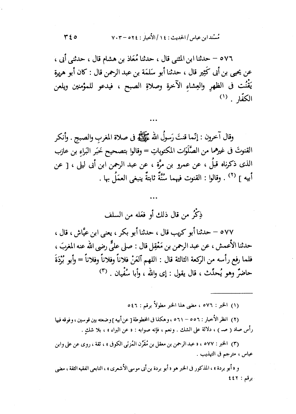 576 - حَدَّثَنَا ابْنُ الْمُثَنَّى، قَالَ: حَدَّثَنَا مُعَاذُ بْنُ هِشَامٍ، قَالَ: حَدَّثَنِي أَبِي، عَنْ يَحْيَى بْنِ أَبِي كَثِيرٍ، قَالَ: حَدَّثَنَا أَبُو سَلَمَةَ بْنُ عَبْدِ الرَّحْمَنِ، قَالَ: كَانَ أَبُو هُرَيْرَةَ «§يَقْنُتُ فِي الظُّهْرِ وَالْعِشَاءِ الْآخِرَةِ وَصَلَاةِ الصُّبْحِ، فَيَدْعُو لِلْمُؤْمِنِينَ وَيَلْعَنُ الْكُفَّارَ» وَقَالَ آخَرُونَ: إِنَّمَا قَنَتَ رَسُولُ اللَّهِ صَلَّى اللهُ عَلَيْهِ وَسَلَّمَ فِي صَلَاةِ الْمَغْرِبِ وَالصُّبْحِ، وَأَنْكَرَ الْقُنُوتَ فِي غَيْرِهِمَا مِنَ الصَّلَوَاتِ الْمَكْتُوبَاتِ، وَقَالُوا بِتَصْحِيحِ خَبَرِ الْبَرَاءِ بْنِ عَازِبٍ الَّذِي ذَكَرْنَاهُ قَبْلُ، عَنْ عَمْرِو بْنِ مُرَّةَ، عَنْ عَبْدِ الرَّحْمَنِ بْنِ أَبِي لَيْلَى، عَنْ أَبِيهِ. وَقَالُوا: الْقُنُوتُ فِيهِمَا سُنَّةٌ ثَابِتَةٌ يَنْبَغِي الْعَمَلُ بِهَا