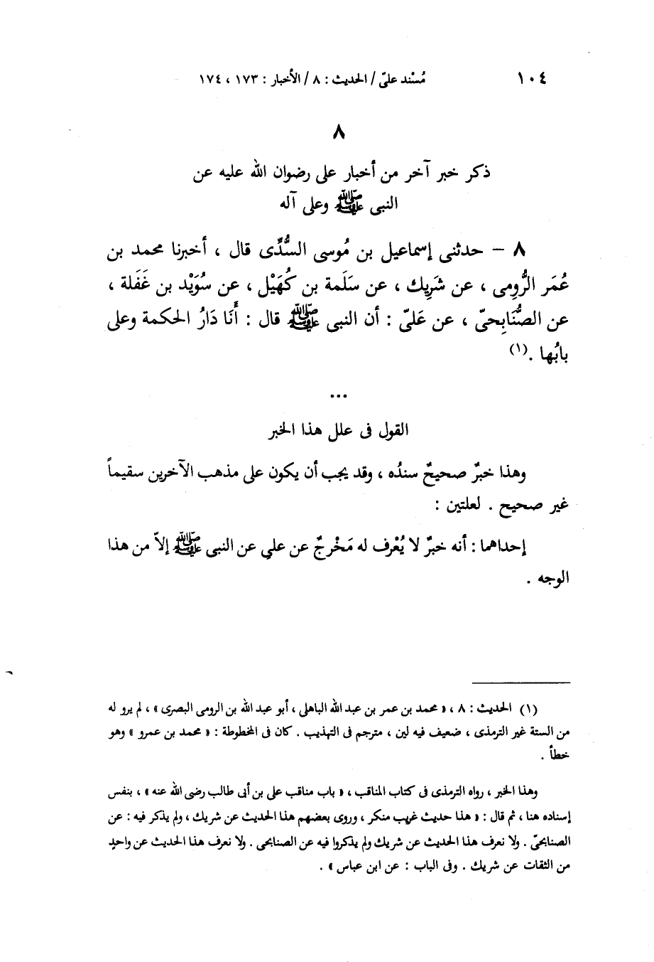 حَدَّثَنِي إِسْمَاعِيلُ بْنُ مُوسَى السُّدِّيُّ، قَالَ: أَخْبَرَنَا مُحَمَّدُ بْنُ عُمَرَ الرُّومِيُّ، عَنْ شَرِيكٍ، عَنْ سَلَمَةَ بْنِ كُهَيْلٍ، عَنْ سُوَيْدِ بْنِ غَفَلَةَ، عَنِ الصُّنَابِحِيّ، عَنْ عَلِيٍّ، أَنَّ النَّبِيَّ صَلَّى اللهُ عَلَيْهِ وَسَلَّمَ قَالَ: «§أَنَا دَارُ الْحِكْمَةِ، وَعَلِيٌّ بَابُهَا» الْقَوْلُ فِي عِلَلِ هَذَا الْخَبَرِ وَهَذَا خَبَرٌ صَحِيحٌ سَنَدُهُ، وَقَدْ يَجِبُ أَنْ يَكُونَ عَلَى مَذْهَبِ الْآخَرِينَ سَقِيمًا غَيْرَ صَحِيحٍ، لِعِلَّتَيْنِ: إِحْدَاهُمَا: أَنَّهُ خَبَرٌ لَا يُعْرَفُ لَهُ مَخْرَجٌ عَنْ عَلِيٍّ عَنِ النَّبِيِّ صَلَّى اللهُ عَلَيْهِ وَسَلَّمَ إِلَّا مِنْ هَذَا الْوَجْهِ -[105]-. وَالْأُخْرَى: أَنَّ سَلَمَةَ بْنَ كُهَيْلٍ عِنْدَهُمْ مِمَّنْ لَا يَثْبُتُ بِنَقْلِهِ حُجَّةٌ. وَقَدْ وَافَقَ عَلِيًّا فِي رِوَايَةِ هَذَا الْخَبَرِ عَنِ النَّبِيِّ صَلَّى اللهُ عَلَيْهِ وَسَلَّمَ غَيْرُهُ