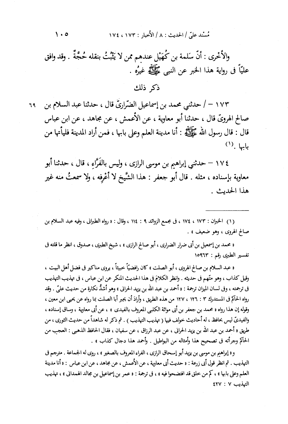 173 - حَدَّثَنِي مُحَمَّدُ بْنُ إِسْمَاعِيلَ الضِّرَارِيُّ، قَالَ: حَدَّثَنَا عَبْدُ السَّلَامِ بْنُ صَالِحٍ الْهَرَوِيُّ، قَالَ: حَدَّثَنَا أَبُو مُعَاوِيَةَ، عَنِ الْأَعْمَشِ، عَنْ مُجَاهِدٍ، عَنِ ابْنِ عَبَّاسٍ، قَالَ: قَالَ رَسُولُ اللَّهِ صَلَّى اللهُ عَلَيْهِ وَسَلَّمَ: «§أَنَا مَدِينَةُ الْعِلْمِ، وَعَلِيٌّ بَابُهَا، فَمَنْ أَرَادَ الْمَدِينَةَ فَلْيَأْتِهَا مِنْ بَابِهَا»
