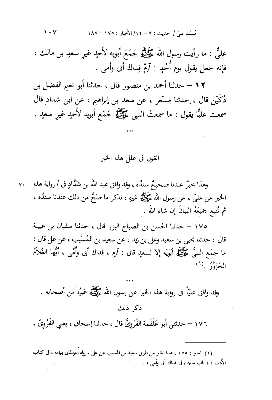 175 - حَدَّثَنَا الْحَسَنُ بْنُ الصَّبَّاحِ الْبَزَّارُ، قَالَ: حَدَّثَنَا سُفْيَانُ بْنُ عُيَيْنَةَ، قَالَ: حَدَّثَنَا يَحْيَى بْنُ سَعِيدٍ، وَعَلِيُّ بْنُ زَيْدٍ، عَنْ سَعِيدِ بْنِ الْمُسَيِّبِ، عَنْ عَلِيٍّ، قَالَ: مَا جَمَعَ النَّبِيُّ صَلَّى اللهُ عَلَيْهِ وَسَلَّمَ أَبَوَيْهِ إِلَّا لِسَعْدٍ قَالَ: " §ارْمِ: فِدَاكَ أَبِي وَأُمِّي، أَيُّهَا الْغُلَامُ الْحَزَوَّرُ " وَقَدْ وَافَقَ عَلِيًّا فِي رِوَايَةِ هَذَا الْخَبَرِ عَنْ رَسُولِ اللَّهِ صَلَّى اللهُ عَلَيْهِ وَسَلَّمَ غَيْرُهُ مِنْ أَصْحَابِهِ. ذِكْرُ ذَلَكَ
