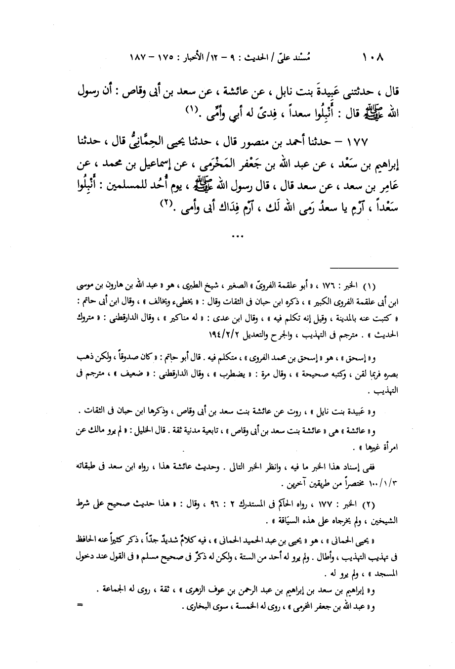 177 - حَدَّثَنَا أَحْمَدُ بْنُ مَنْصُورٍ، قَالَ: حَدَّثَنَا يَحْيَى الْحِمَّانِيُّ، قَالَ: حَدَّثَنَا إِبْرَاهِيمُ بْنُ سَعْدٍ، عَنْ عَبْدِ اللَّهِ بْنِ جَعْفَرٍ الْمُخَرِّمِيِّ، عَنْ إِسْمَاعِيلَ بْنِ مُحَمَّدٍ، عَنْ عَامِرِ بْنِ سَعْدٍ، عَنْ سَعْدٍ، قَالَ: قَالَ رَسُولُ اللَّهِ صَلَّى اللهُ عَلَيْهِ وَسَلَّمَ يَوْمَ أُحُدٍ لِلْمُسْلِمِينَ: «§أَنْبِلُوا سَعْدًا، ارْمِ يَا سَعْدُ , رَمَى اللَّهُ لَكَ، ارْمِ، فِدَاكَ أَبِي وَأُمِّي» -[109]- الْقَوْلُ فِي الْبَيَانِ عَنْ هَذَا الْخَبَرِ، وَعَمَّا فِيهِ مِنَ الْفِقْهِ إِنْ قَالَ لَنَا قَائِلٌ: أَرَأَيْتَ قَوْلَ عَلِيٍّ: مَا سَمِعْتُ رَسُولَ اللَّهِ صَلَّى اللهُ عَلَيْهِ وَسَلَّمَ يُفَدِّي رَجُلًا قَطُّ غَيْرَ سَعْدِ بْنِ أَبِي وَقَّاصٍ، أَصَحِيحٌ أَمْ سَقِيمٌ؟ فَإِنْ كَانَ سَقِيمًا، فَمَا السَّبَبُ الَّذِي أَسْقَمَهُ؟ وَإِنْ كَانَ صَحِيحًا فَمَا أَنْتَ قَائِلٌ فِيمَا