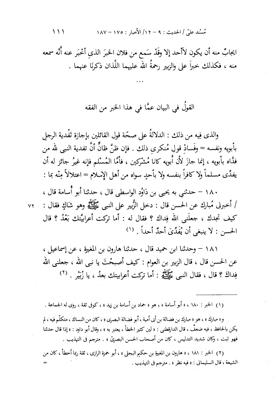 180 - حَدَّثَنِي بِهِ يَحْيَى بْنُ دَاوُدَ الْوَاسِطِيُّ قَالَ: حَدَّثَنَا أَبُو أُسَامَةَ، قَالَ: أَخْبَرَنِي مُبَارَكٌ، عَنِ الْحَسَنِ، قَالَ: " دَخَلَ الزُّبَيْرُ عَلَى النَّبِيِّ صَلَّى اللهُ عَلَيْهِ وَسَلَّمَ وَهُوَ شَاكٍ، فَقَالَ: كَيْفَ تَجِدُكَ، جَعَلَنِي اللَّهُ فِدَاكَ؟ فَقَالَ لَهُ: «§أَمَا تَرَكْتَ أَعْرَابِيَّتَكَ بَعْدُ؟» . قَالَ الْحَسَنُ: لَا يَنْبَغِي أَنْ يُفَدِّيَ أَحَدٌ أَحَدًا "