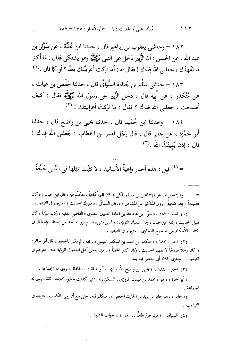 184 - وَحَدَّثَنَا ابْنُ حُمَيْدٍ، قَالَ: حَدَّثَنَا يَحْيَى بْنُ وَاضِحٍ، قَالَ: حَدَّثَنَا أَبُو حَمْزَةَ، عَنْ جَابِرٍ، قَالَ: قَالَ رَجُلٌ لِعُمَرَ بْنِ الْخَطَّابِ: جَعَلَنِي اللَّهُ فِدَاكَ، قَالَ: «§إِذَنْ يُهِينُكَ اللَّهُ» قِيلَ: هَذِهِ أَخْبَارٌ وَاهِيَةُ الْأَسَانِيدِ، لَا تَثْبُتُ بِمِثْلِهَا فِي الدِّينِ حُجَّةٌ -[113]-، وَذَلِكَ أَنَّ مَرَاسِيلَ الْحَسَنِ أَكْثَرُهَا صُحُفٌ غَيْرُ سَمَاعٍ، وَأَنَّهُ إِذَا وُصِلَتِ الْأَخْبَارُ فَأَكْثَرُ رِوَايَتِهِ عَنْ مَجَاهِيلَ لَا يُعْرَفُونَ. وَمَنْ كَانَ كَذَلِكَ فِيمَا يَرْوِي مِنَ الْأَخْبَارِ، فَإِنَّ الْوَاجِبَ عِنْدَنَا أَنْ نَتَثَبَّتَ فِي مَرَاسِيلِهِ، وَأَنَّ الْمُنْكَدِرَ بْنَ مُحَمَّدٍ عِنْدَ أَهْلِ النَّقْلِ مِمَّنْ لَا يُعْتَمَدُ عَلَى نَقْلِهِ. وَبَعْدُ، فَلَوْ كَانَتْ هَذِهِ الْأَخْبَارُ الَّتِي ذَكَرْنَاهَا عَنِ الْمُنْكَدِرِ بْنِ مُحَمَّدٍ عَنِ الْحَسَنِ، عَنْ رَسُولِ اللَّهِ صَلَّى اللهُ عَلَيْهِ وَسَلَّمَ صِحَاحًا، لَمْ يَكُنْ فِيهَا لِمُحْتَجٍّ بِهَا حُجَّةٌ فِي إِبْطَالِ مَا رَوَيْنَا عَنْ عَلِيٍّ , وَالزُّبَيْرِ رَحْمَةُ اللَّهِ عَلَيْهِمَا، عَنْ رَسُولِ اللَّهِ صَلَّى اللهُ عَلَيْهِ وَسَلَّمَ، مِنَ الْخَبَرَيْنِ اللَّذَيْنِ ذَكَرْنَاهُمَا عَنْهُ أَنَّهُ فَدَّى مَنْ فَدَّى بِأَبَوَيْهِ، وَلَا كَانَ فِي ذَلِكَ دَلَالَةٌ عَلَى أَنَّ قِيلَ ذَلِكَ غَيْرُ جَائِزٍ، إِذْ لَا بَيَانَ فِيهِ أَنَّ رَسُولَ اللَّهِ صَلَّى اللهُ عَلَيْهِ وَسَلَّمَ نَهَى الزُّبَيْرَ عَنْ قِيلِ ذَلِكَ لَهُ , بَلْ إِنَّمَا فِيهِ أَنَّ النَّبِيَّ صَلَّى اللهُ عَلَيْهِ وَسَلَّمَ قَالَ لَهُ: «أَمَا تَرَكْتَ أَعْرَابِيَّتَكَ بَعْدُ» , وَالْمَعْرُوفُ مِنْ قِيلِ الْقَائِلِ إِذَا قَالَ: إِنَّ فُلَانًا لَمْ يَتْرُكْ أَعْرَابِيَّتَهُ بَعْدُ، أَنَّهُ إِنَّمَا نَسَبُهُ إِلَى الْجَفَاءِ لَا إِلَى فِعْلِ مَا لَا يَجُوزُ فِعْلُهُ. فَلَوْ صَحَّ خَبَرُ الْحَسَنِ الَّذِي رَوَاهُ عَنِ النَّبِيِّ صَلَّى اللهُ عَلَيْهِ وَسَلَّمَ فِي قِيلِهِ مَا قَالَ لِلزُّبَيْرِ، لَمْ يَعْدُ أَنْ يَكُونَ ذَلِكَ كَانَ مِنَ النَّبِيِّ صَلَّى اللهُ عَلَيْهِ وَسَلَّمَ نِسْبَةً لِقَوْلِ الزُّبَيْرِ الَّذِي قَالَ لَهُ إِلَى الْجَفَاءِ، وَإعْلَامًا مِنْهُ لَهُ أَنَّ غَيْرَهُ مِنَ الْقَوْلِ وَالتَّحِيَّةِ أَلْطَفُ وَأَرَقُّ مِنْهُ، هَذَا هَذَا. وَقَدْ رُوِّينَا عَنْ جَمَاعَةٍ مِنْ أَصْحَابِ رَسُولِ اللَّهِ صَلَّى اللهُ عَلَيْهِ وَسَلَّمَ بِأَسَانِيدَ لَا تُشْبِهُ أَسَانِيدَ خَبَرِ الْحَسَنِ فِي الصِّحَّةِ، أَنَّهُمْ قَالُوا لِرَسُولِ اللَّهِ صَلَّى اللهُ عَلَيْهِ وَسَلَّمَ: جَعَلْنَا اللَّهُ فِدَاكَ، فَلَمْ يُنْكِرْ ذَلِكَ عَلَيْهِمْ، وَلَمْ يُغَيِّرْ، نَذْكُرُ مِنْ ذَلِكَ مَا حَضَرَنَا ذِكْرُهُ