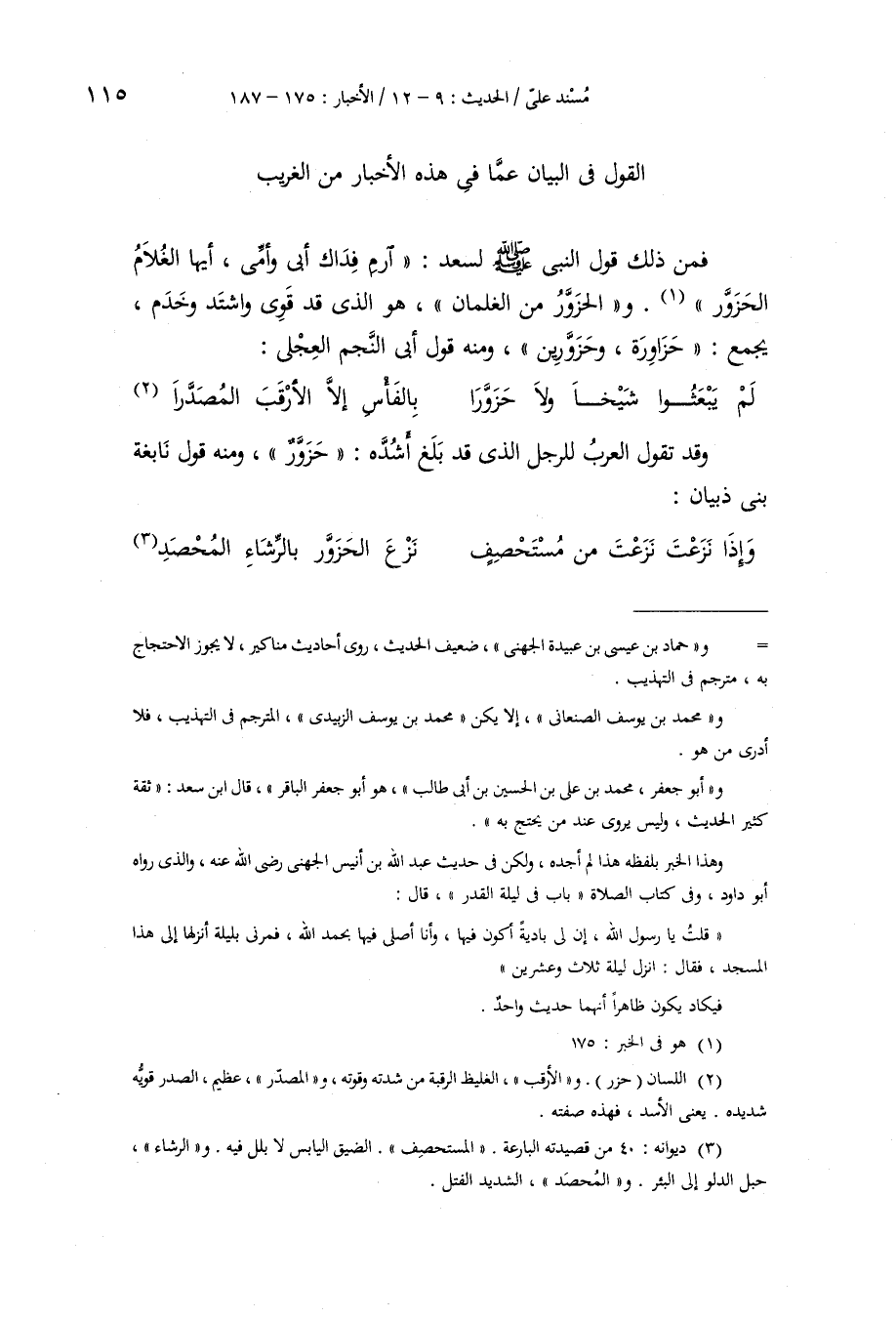 §الْقَوْلُ فِي الْبَيَانِ عَمَّا فِي هَذِهِ الْأَخْبَارِ مِنَ الْغَرِيبِ «فَمِنْ ذَلِكَ قَوْلُ النَّبِيِّ صَلَّى اللهُ عَلَيْهِ وَسَلَّمَ لِسَعْدٍ» ارْمِ، فِدَاكَ أَبِي وَأُمِّي، أَيُّهَا الْغُلَامُ الْحَزَوَّرُ ". وَالْحَزَوَّرُ مِنَ الْغِلْمَانِ هُوَ الَّذِي قَدْ قَوِيَ وَاشْتَدَّ وَخَدَمَ، يُجْمَعُ: حَزَاوِرَةٌ، وَحَزَوَّرِينَ، وَمِنْهُ قَوْلُ أَبِي النَّجْمِ الْعِجْلِيِّ: