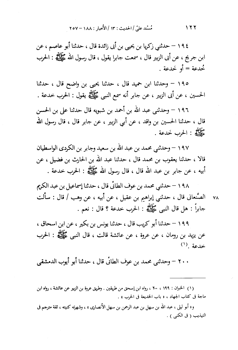 196 - وَحَدَّثَنِي عَبْدُ اللَّهِ بْنُ أَحْمَدَ بْنِ شَبُّوَيْهِ، قَالَ: حَدَّثَنَا عَلِيُّ بْنُ الْحَسَنِ، قَالَ: حَدَّثَنَا الْحُسَيْنُ بْنُ وَاقِدٍ، عَنْ أَبِي الزُّبَيْرِ، عَنْ جَابِرٍ، قَالَ: قَالَ رَسُولُ اللَّهِ صَلَّى اللهُ عَلَيْهِ وَسَلَّمَ: «§الْحَرْبُ خُدْعَةٌ»