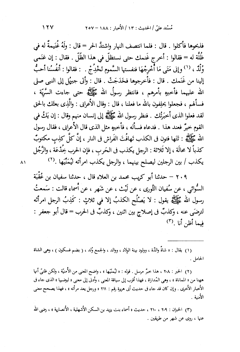 209 - حَدَّثَنَا أَبُو كُرَيْبٍ مُحَمَّدُ بْنُ الْعَلَاءِ قَالَ: حَدَّثَنَا سُفْيَانُ بْنُ عُقْبَةَ السُّوَائِيُّ، عَنْ سُفْيَانَ الثَّوْرِيِّ، عَنْ لَيْثٍ، عَنْ شَهْرٍ، عَنْ أَسْمَاءَ، قَالَتْ: سَمِعْتُ رَسُولَ اللَّهِ صَلَّى اللهُ عَلَيْهِ وَسَلَّمَ يَقُولُ: " §لَا يَصْلُحُ الْكَذِبُ إِلَّا فِي ثَلَاثٍ: كَذِبُ الرَّجُلِ امْرَأَتَهُ لِتَرْضَى عَنْهُ، وَكَذِبٌ فِي إِصْلَاحٍ بَيْنَ اثْنَيْنِ، وَكَذِبٌ فِي الْحَرْبِ " قَالَ أَبُو جَعْفَرٍ: فِيمَا أَظُنُّ أَنَا