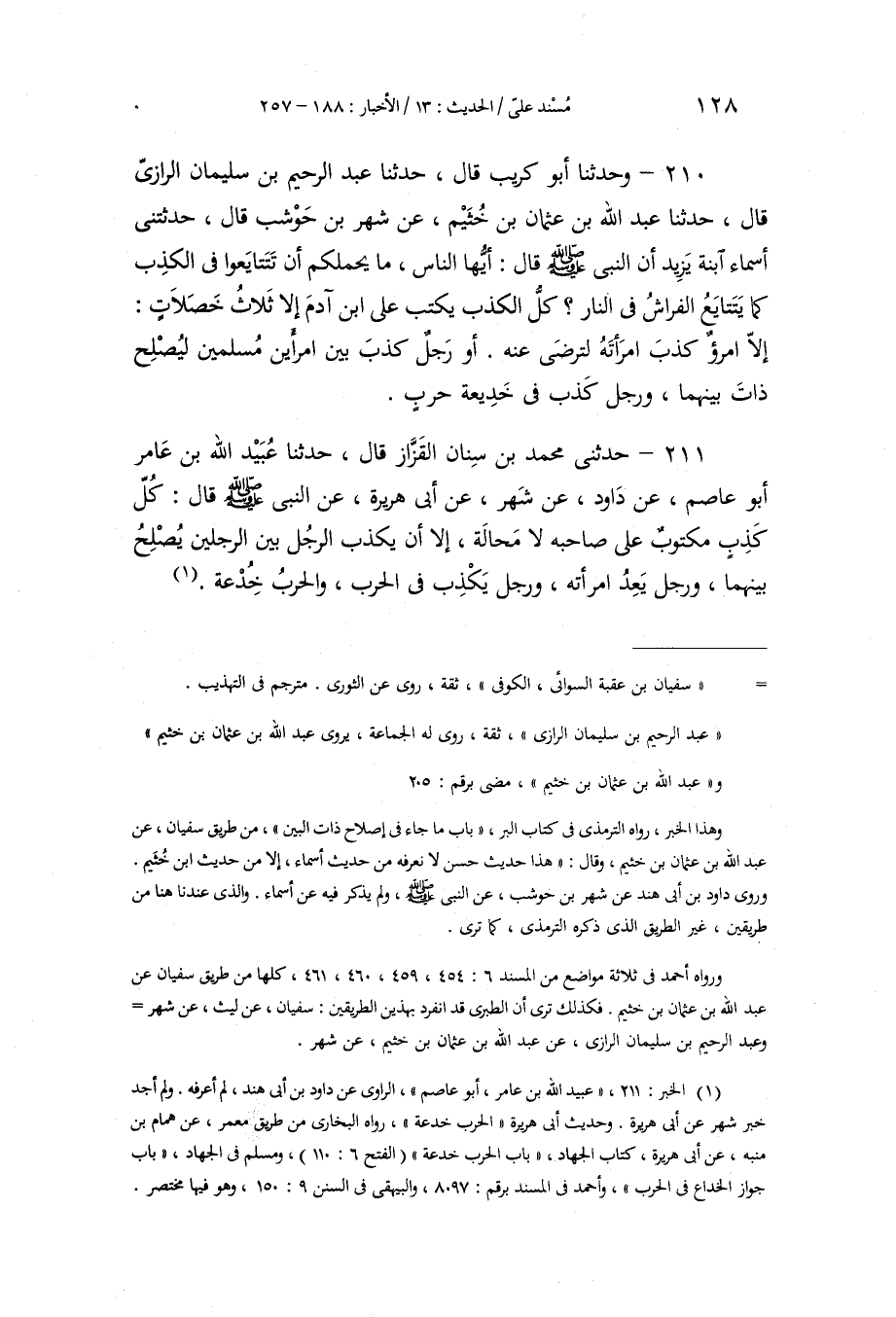 210 - وَحَدَّثَنَا أَبُو كُرَيْبٍ، قَالَ: حَدَّثَنَا عَبْدُ الرَّحِيمِ بْنُ سُلَيْمَانَ الرَّازِيُّ، قَالَ: حَدَّثَنَا عَبْدُ اللَّهِ بْنُ عُثْمَانَ بْنِ خُثَيْمٍ، عَنْ شَهْرِ بْنِ حَوْشَبٍ، قَالَ: حَدَّثَتْنِي أَسْمَاءُ ابْنَةُ يَزِيدَ، أَنَّ النَّبِيَّ صَلَّى اللهُ عَلَيْهِ وَسَلَّمَ قَالَ: " §أَيُّهَا النَّاسُ، مَا يَحْمِلُكُمْ أَنْ تَتَايَعُوا فِي الْكَذِبِ كَمَا يَتَتَايَعُ الْفَرَاشُ فِي النَّارِ؟ كُلُّ الْكَذِبِ يُكْتَبُ عَلَى ابْنِ آدَمَ إِلَّا ثَلَاثُ خَصَلَاتٍ: إِلَّا امْرُؤٌ كَذَبَ امْرَأَتَهُ لِتَرْضَى عَنْهُ. أَوْ رَجُلٌ كَذَبَ بَيْنَ امْرَأَيْنِ مُسْلِمَيْنِ لِيُصْلِحَ ذَاتَ بَيْنِهِمَا، وَرَجُلٌ كَذَبَ فِي خَدِيعَةِ حَرْبٍ "